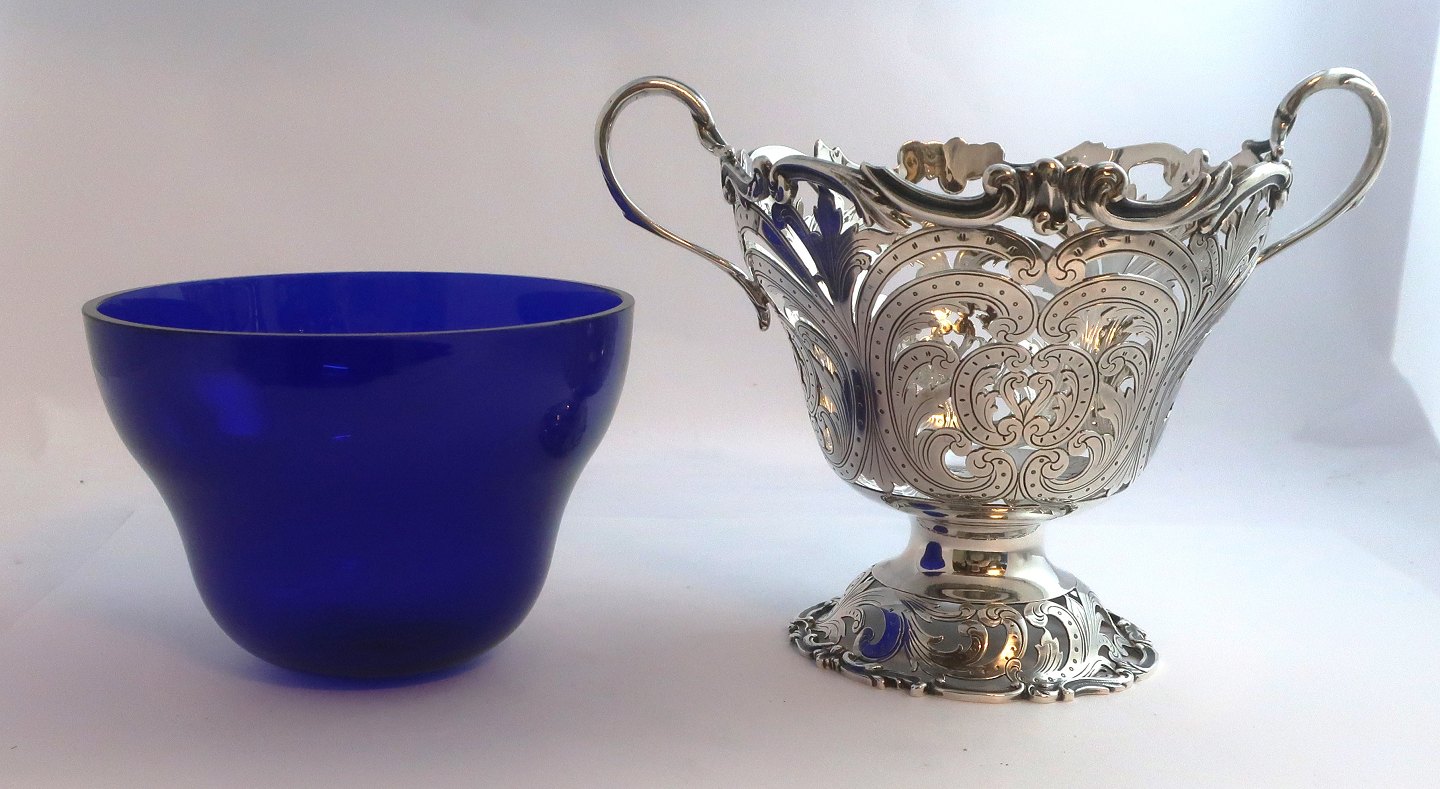 Michelsen. Sølvskål med blå glas indsats (830). Højde 15 cm. Produceret 1915.