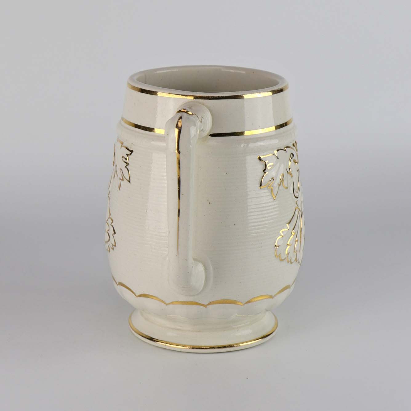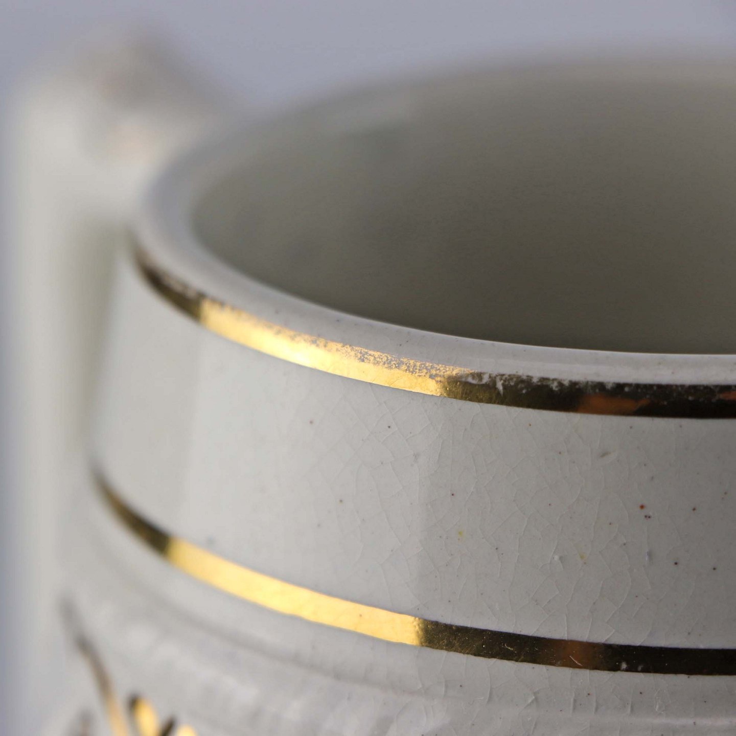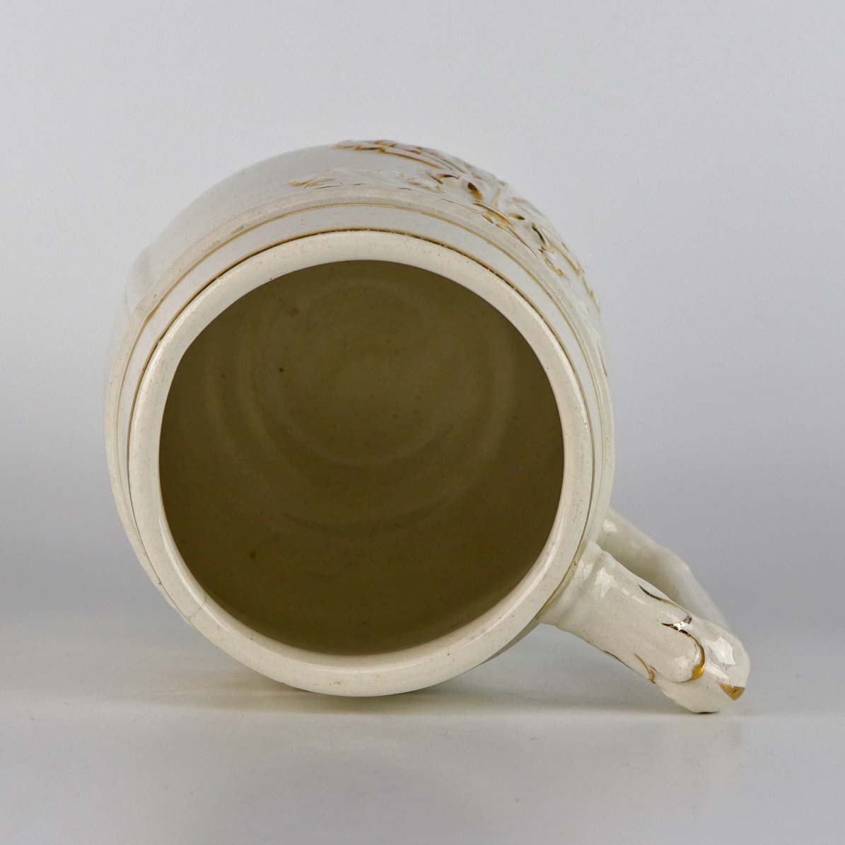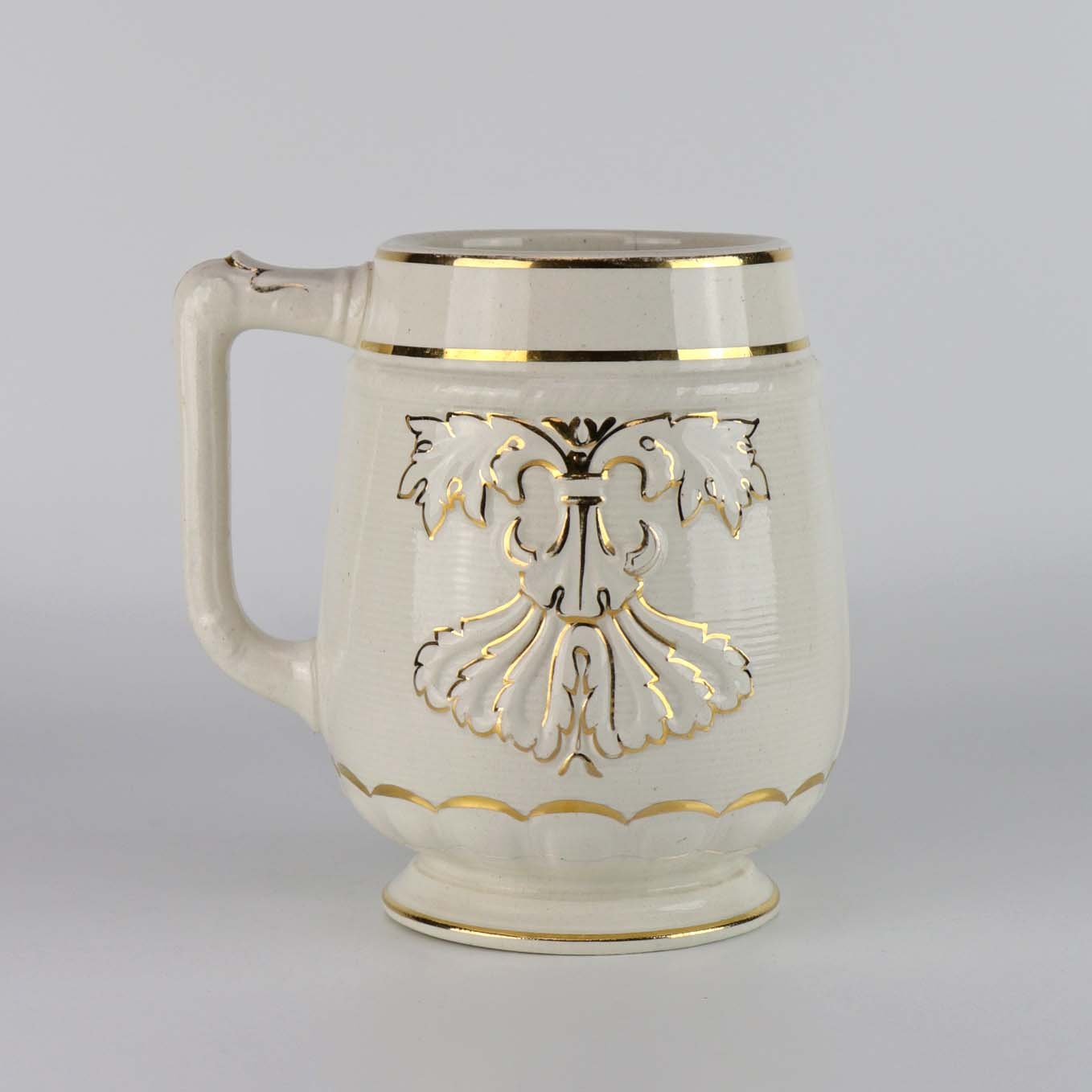 Antik ølkrus i fajance, som også er kendt under navnet Portlands krus. Dette Romerske krus er fremstillet i perioden år 1877-1923 og er dekoreret med motiv af bladligende mønster med guldkant