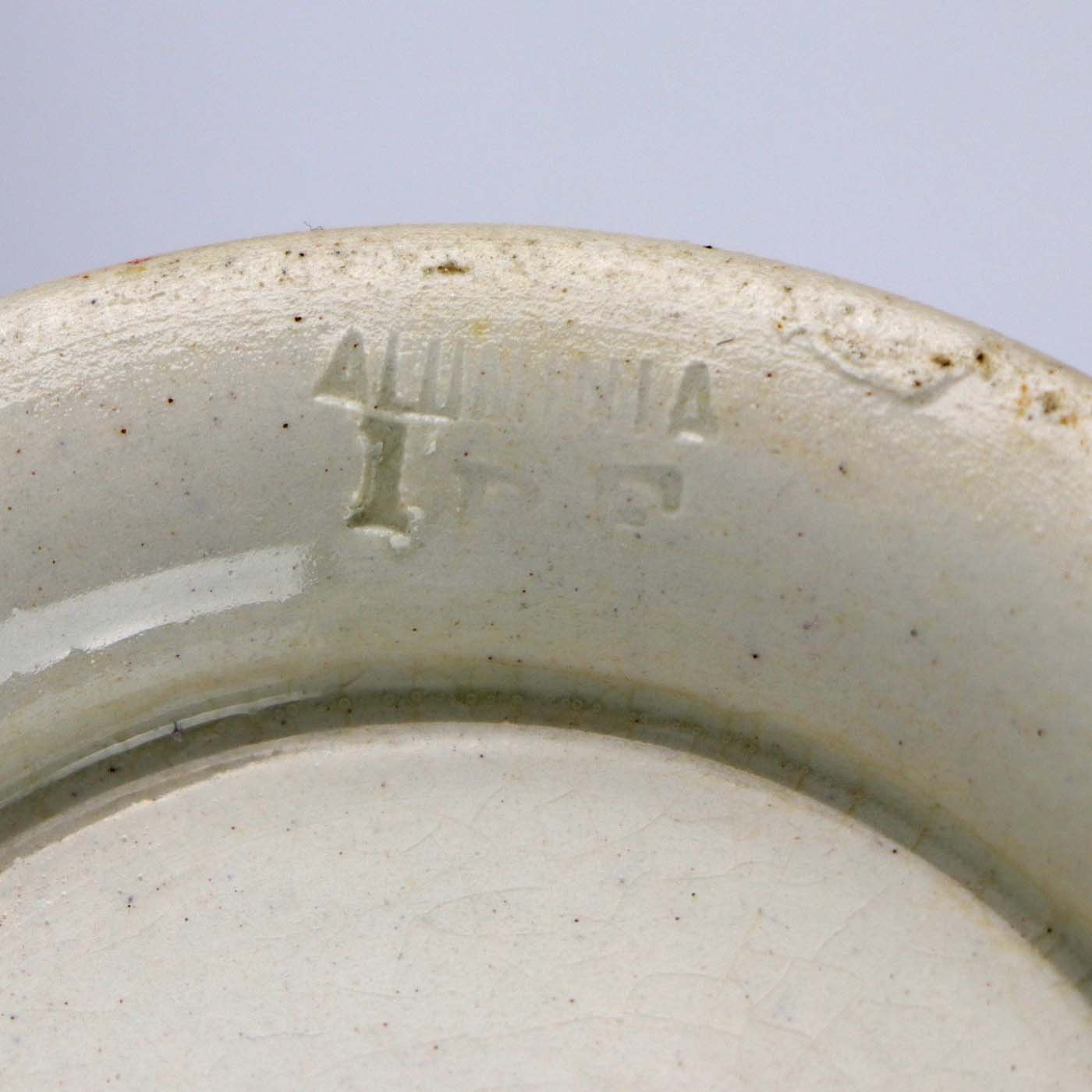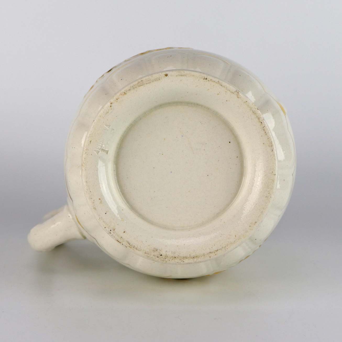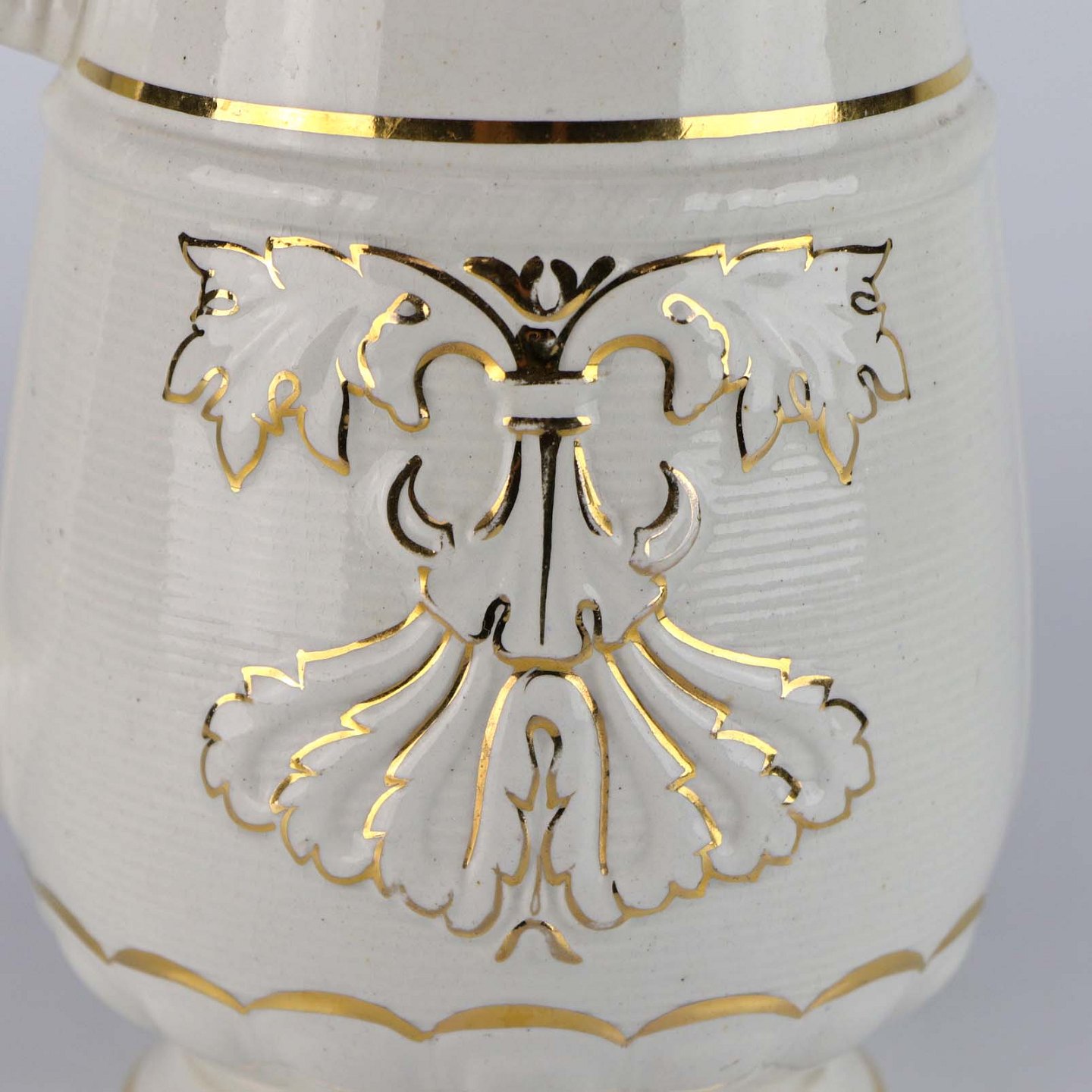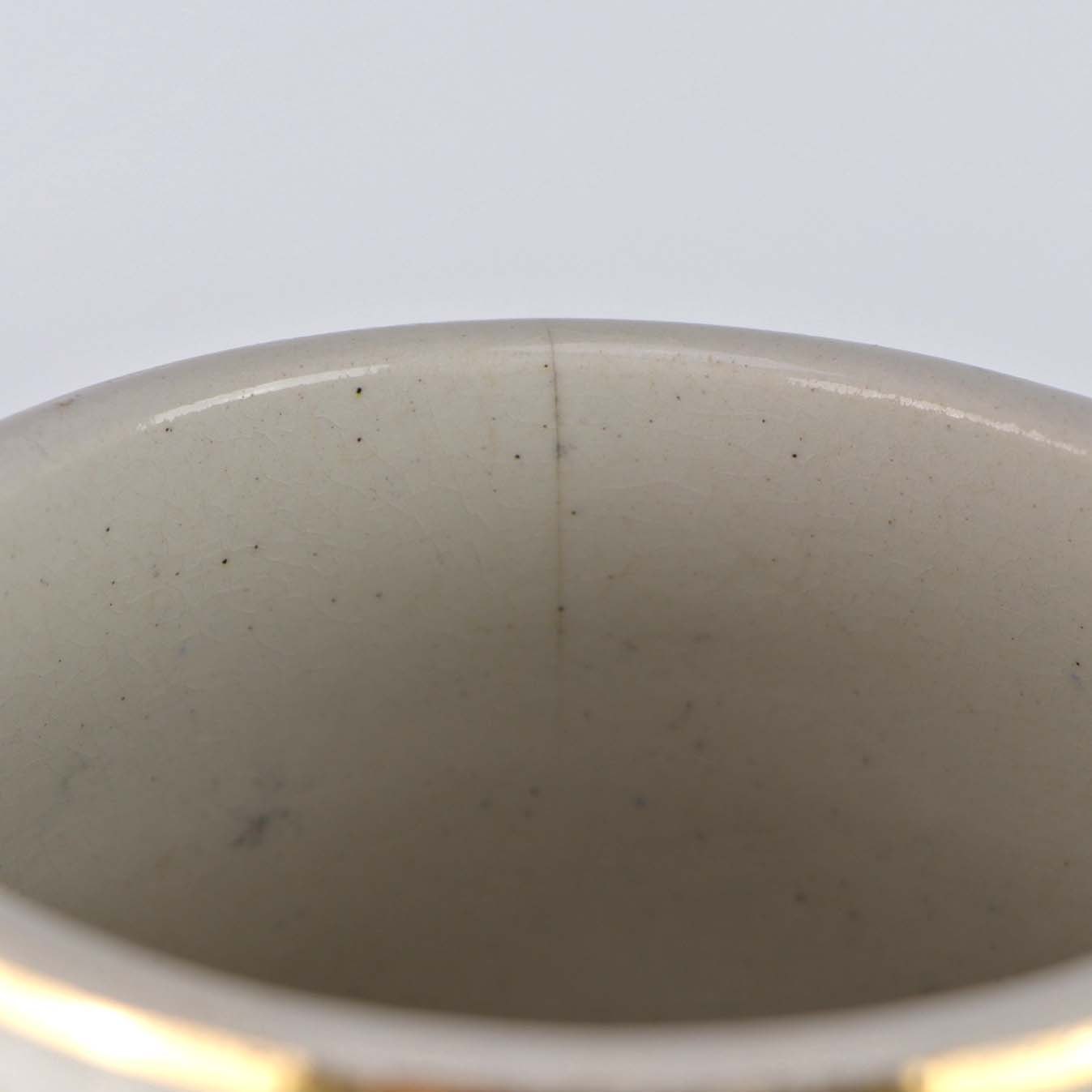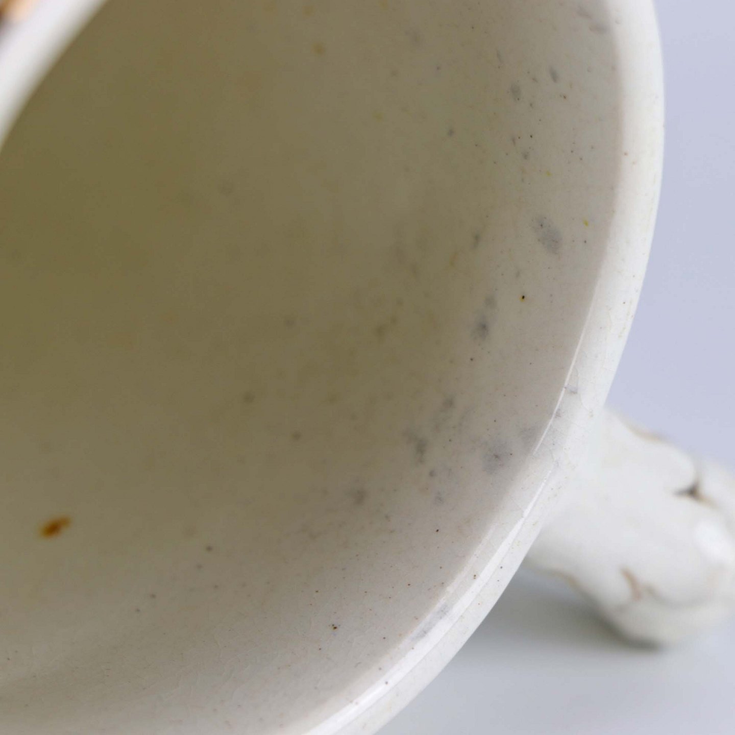 Antik ølkrus i fajance, som også er kendt under navnet Portlands krus. Dette Romerske krus er fremstillet i perioden år 1877-1923 og er dekoreret med motiv af bladligende mønster med guldkant