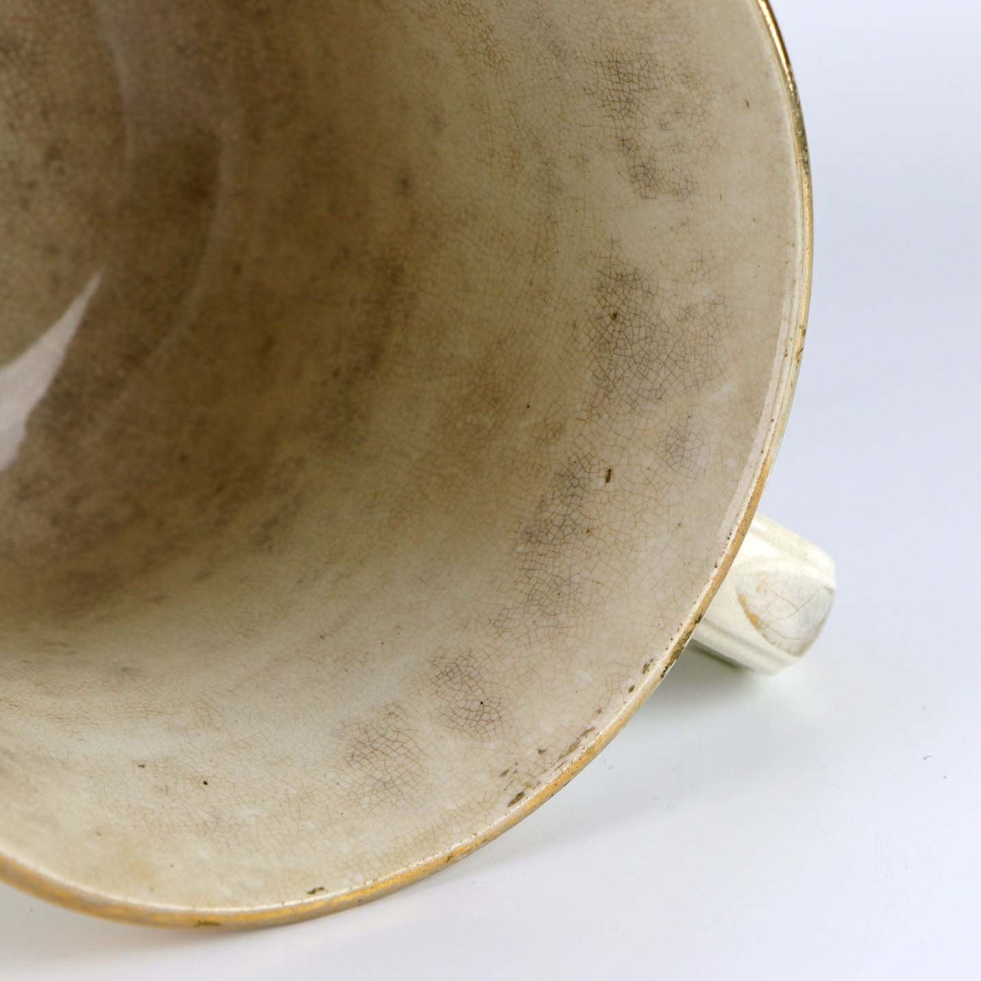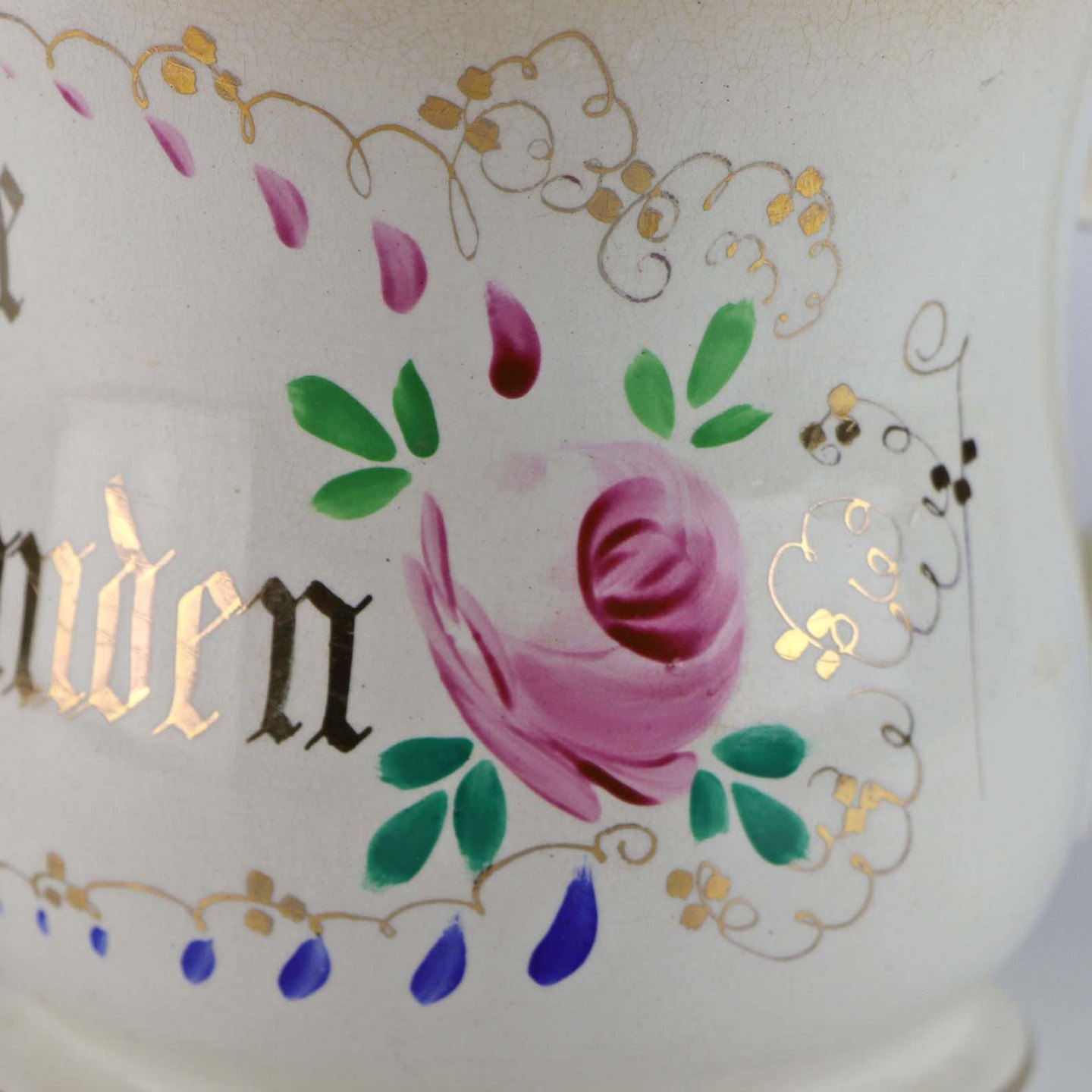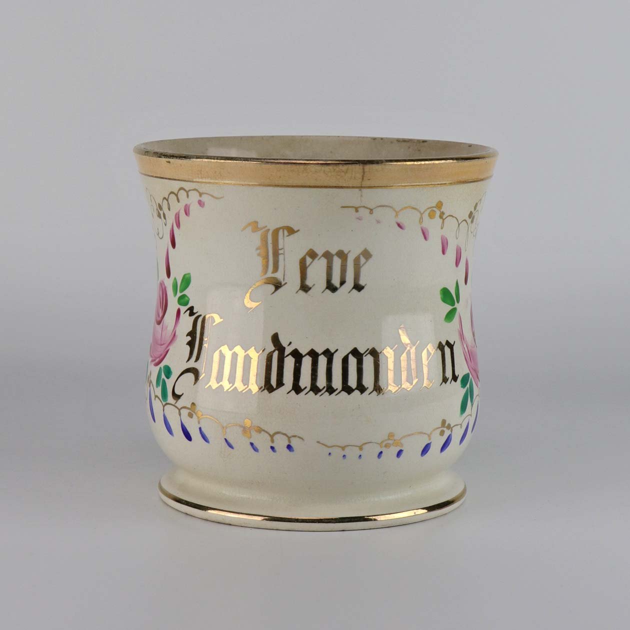Antik ølkrus i fajance, som også er kendt under navnet Portlands krus. Dette krus er fremstillet i perioden år 1885-1923 og er dekoreret blomsterranker og teksten Leve Landmanden i guldtryk