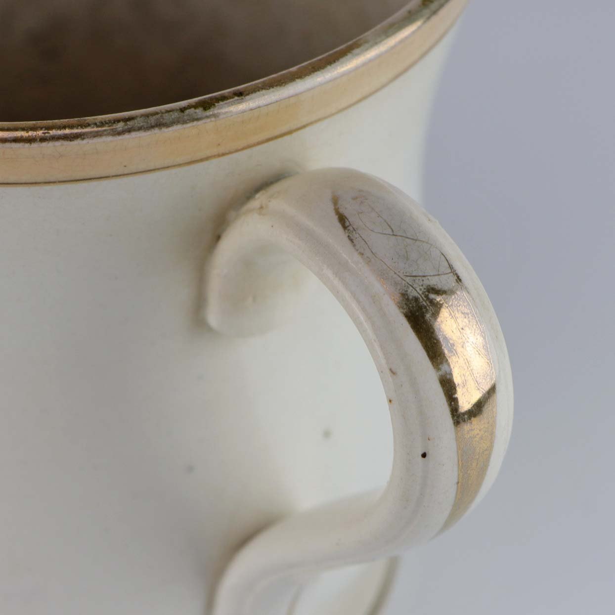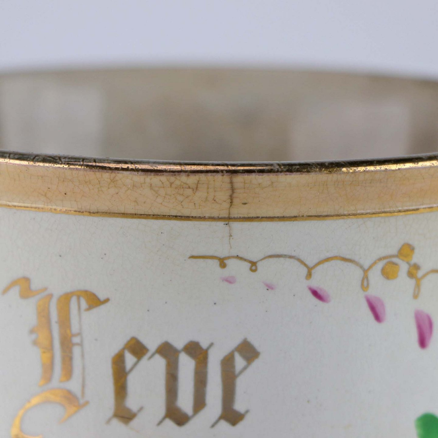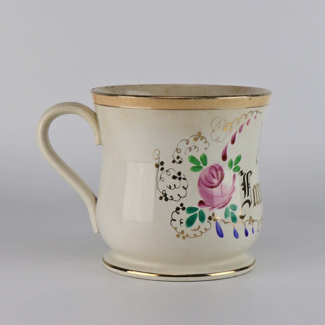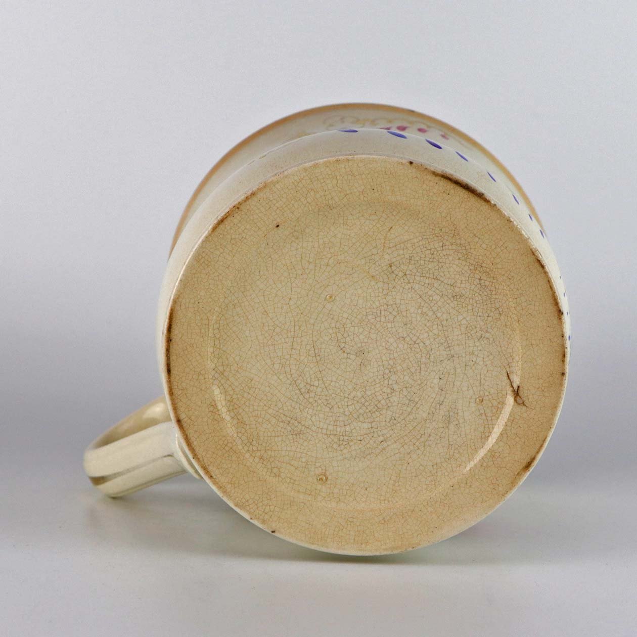 Antik ølkrus i fajance, som også er kendt under navnet Portlands krus. Dette krus er fremstillet i perioden år 1885-1923 og er dekoreret blomsterranker og teksten Leve Landmanden i guldtryk