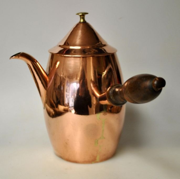 Danish Empire coffee pot, 19th century. Stamped: Kobbermøllen ved Flensborg. With spout, turned wooden handle and lid with brass knob. H.: 23 cm.
