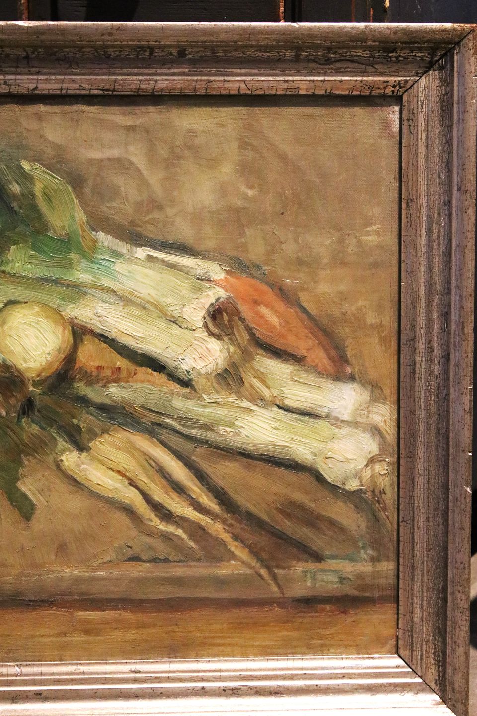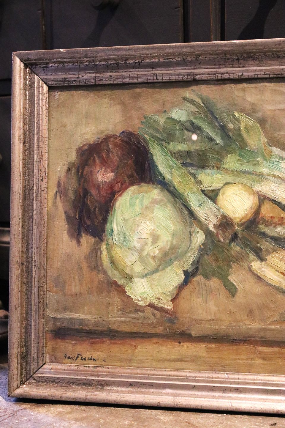Decorative Still life with vegetables, oil painting on canvas framed in an old silver frame with glass.