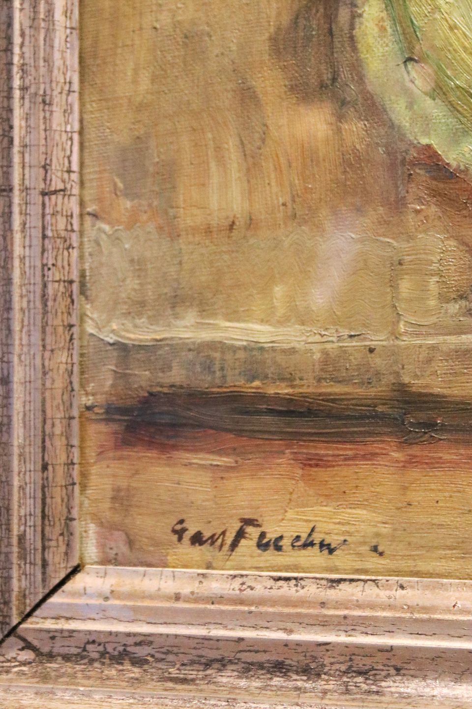 Decorative still life oil painting on canvas in old silver frame Signed Carl Fischer.