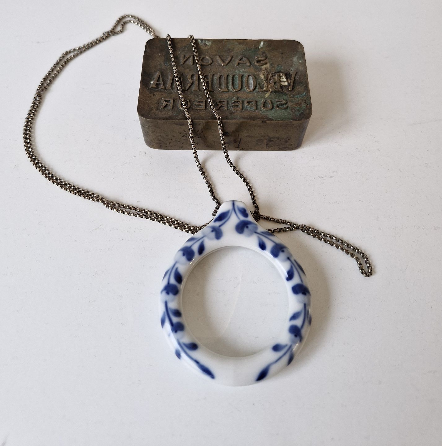 Royal Copenhagen forstørrelsesglas i porcelænsramme dekoreret med blå blomster i lang kæde