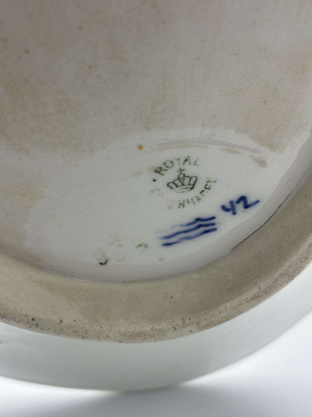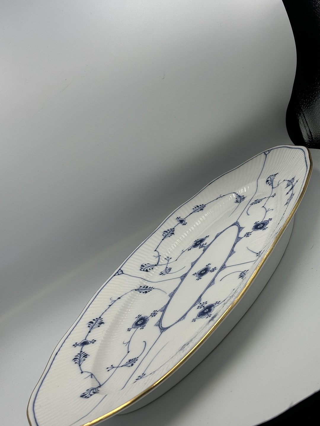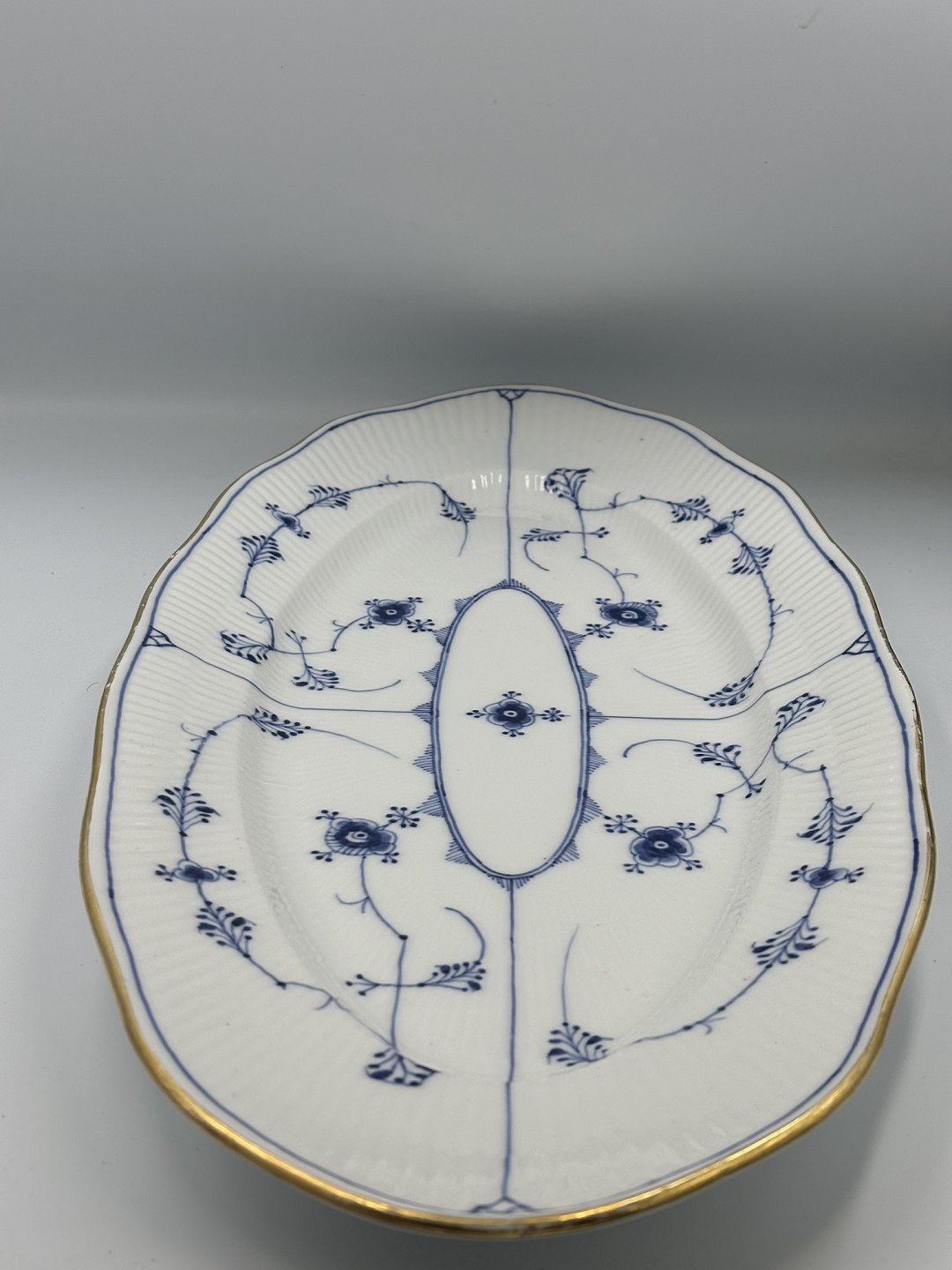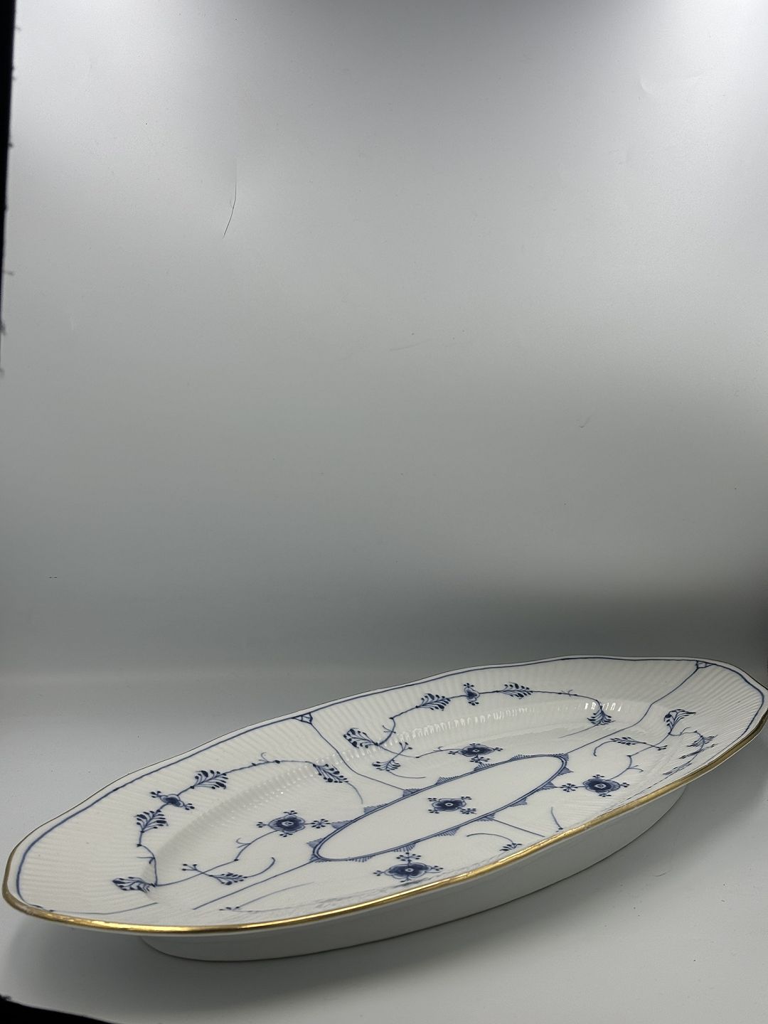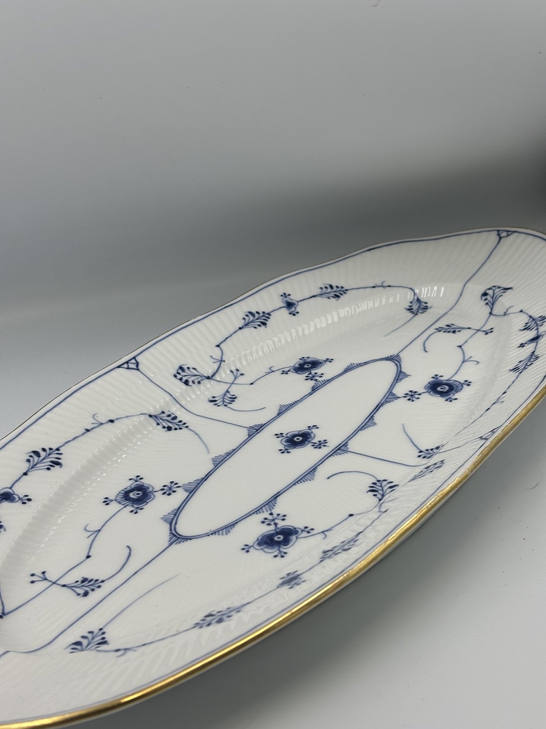 Text available in Danish: Royal Copenhagen Musselmalet Riflet aflangt Fiskefad
