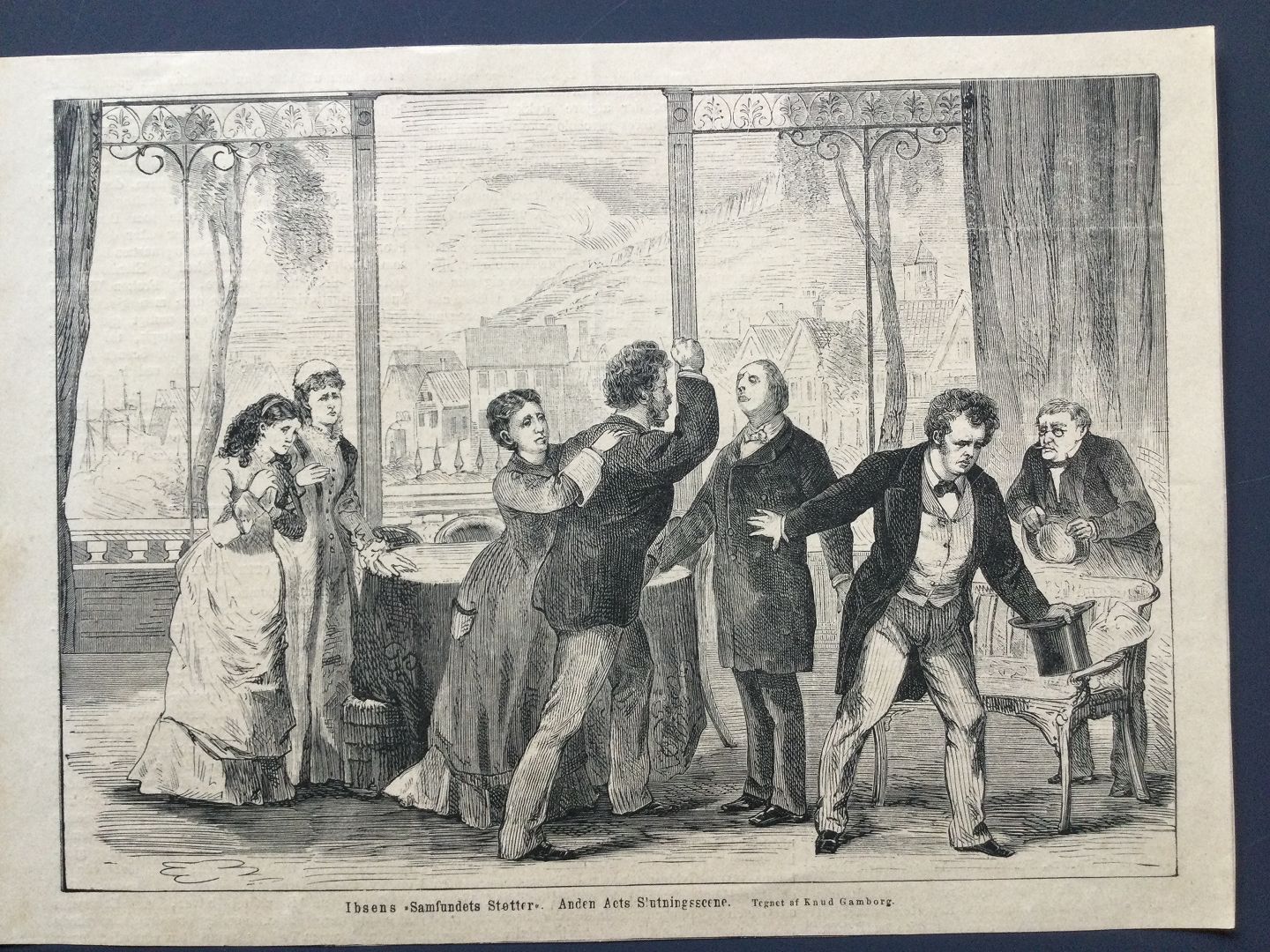 Xylografi af Knud Gamborg - illustration til Henrik Ibsens "Samfundets Støtter"