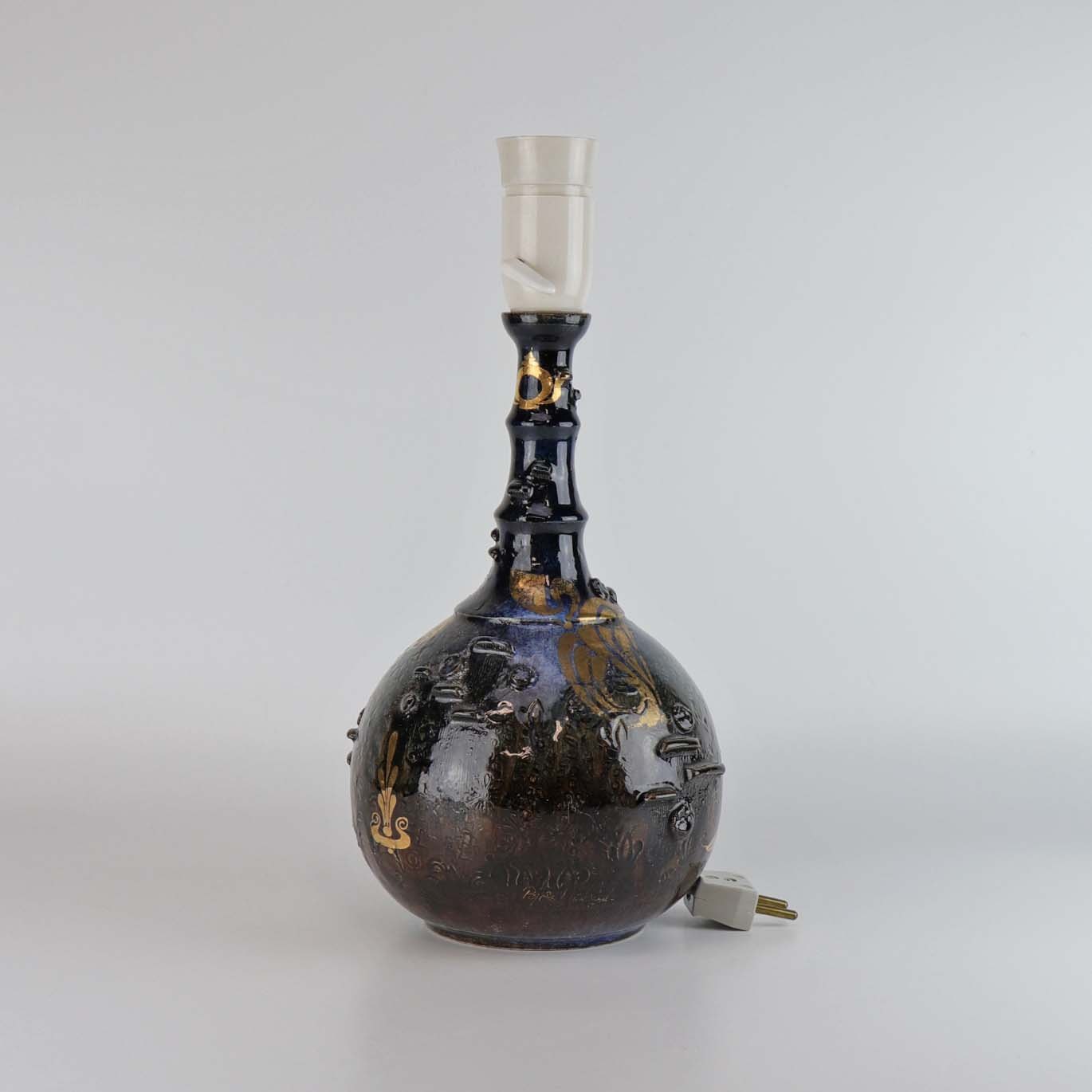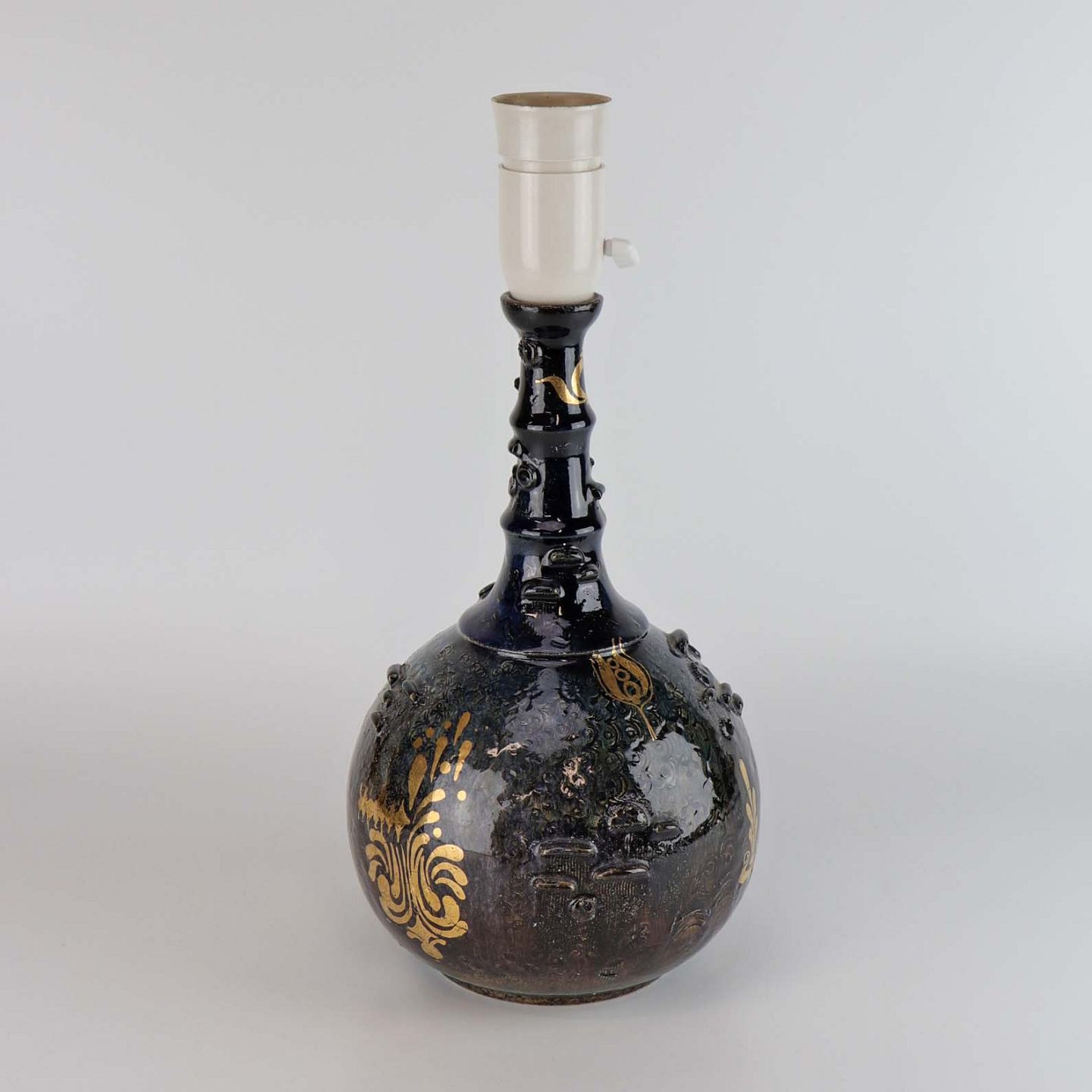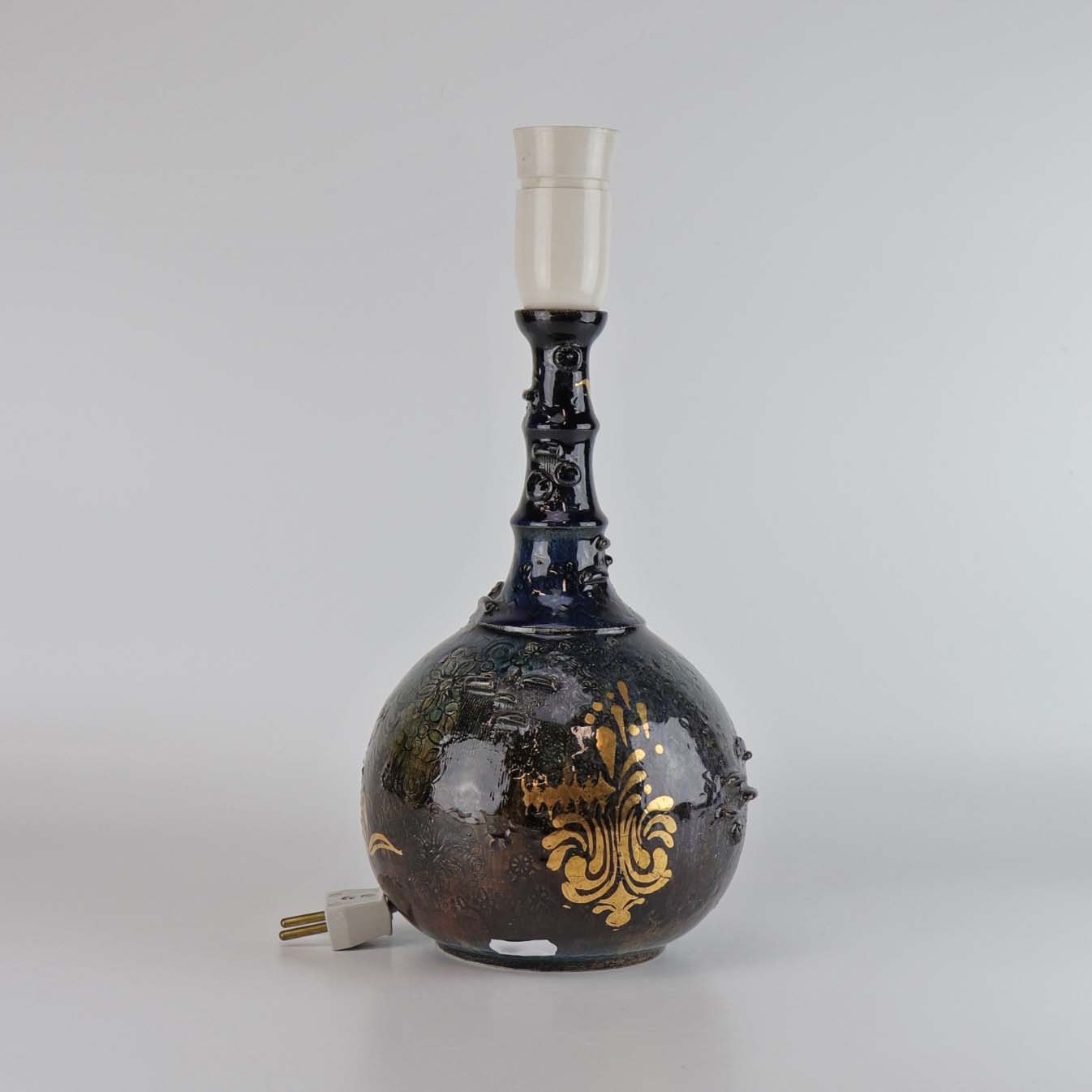 Lampefod i keramik med mørk glasering og dekoration af blomster og abstrakte gyldne motiver. Ledningen er opbevaret indeni foden.