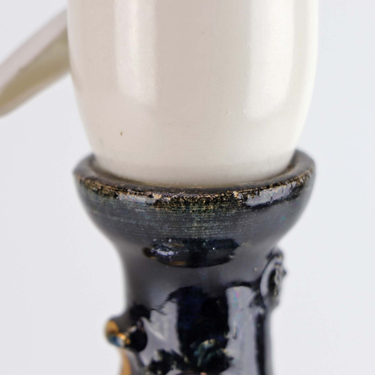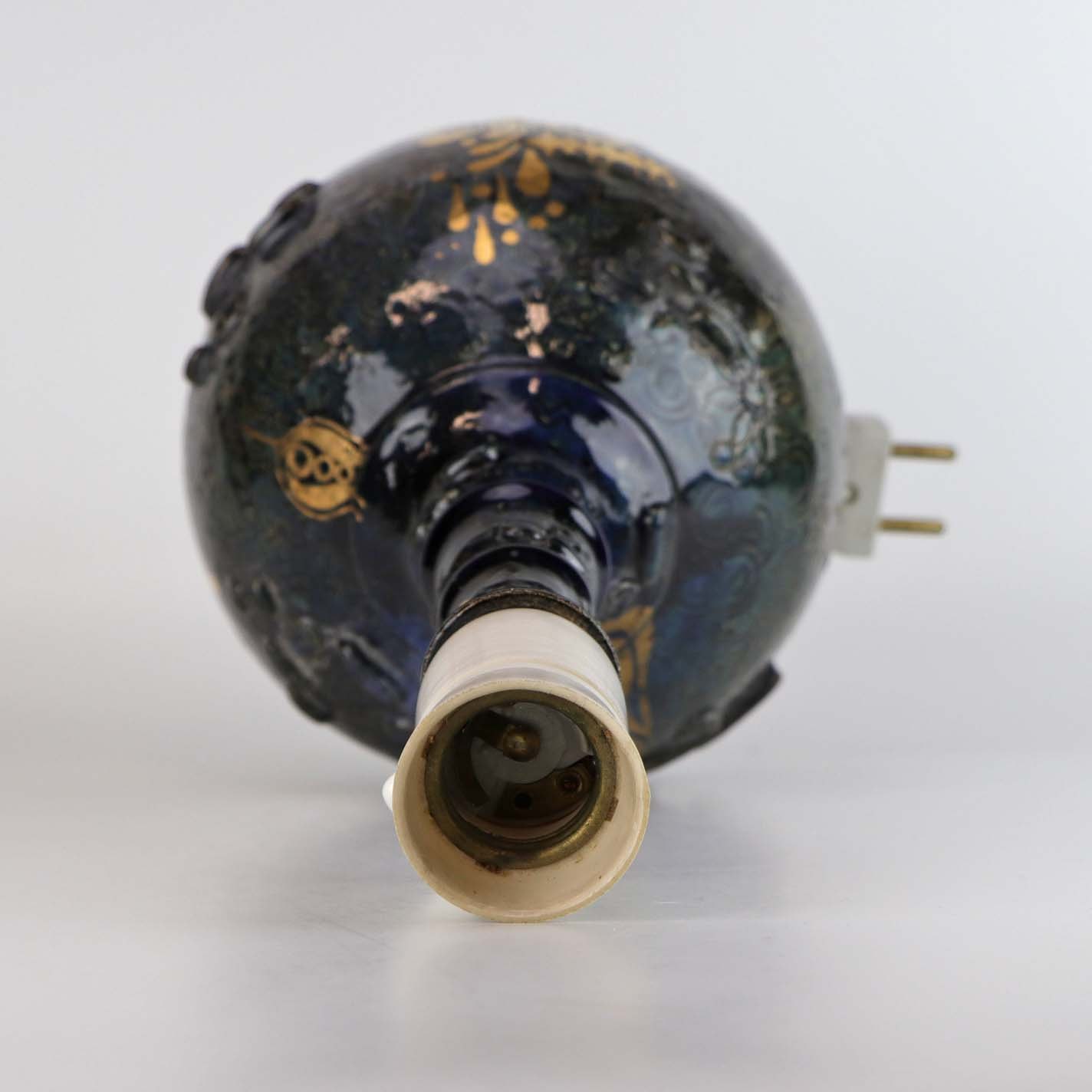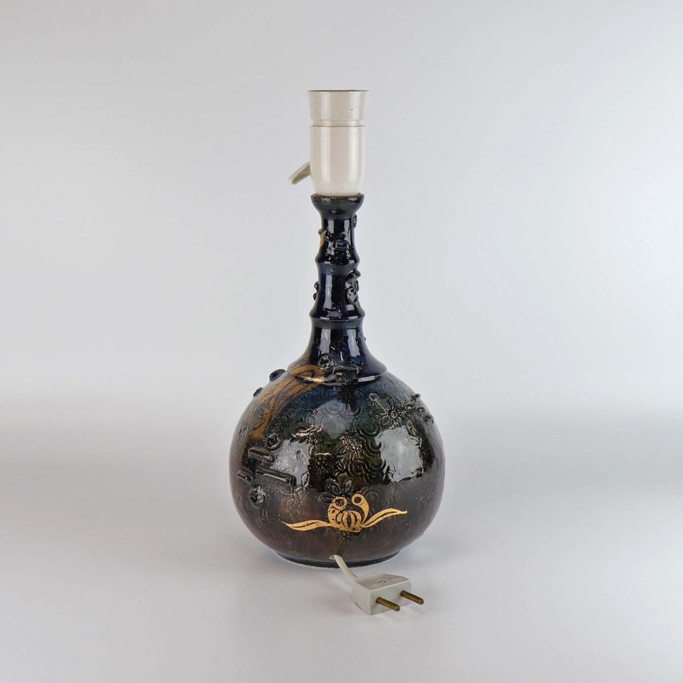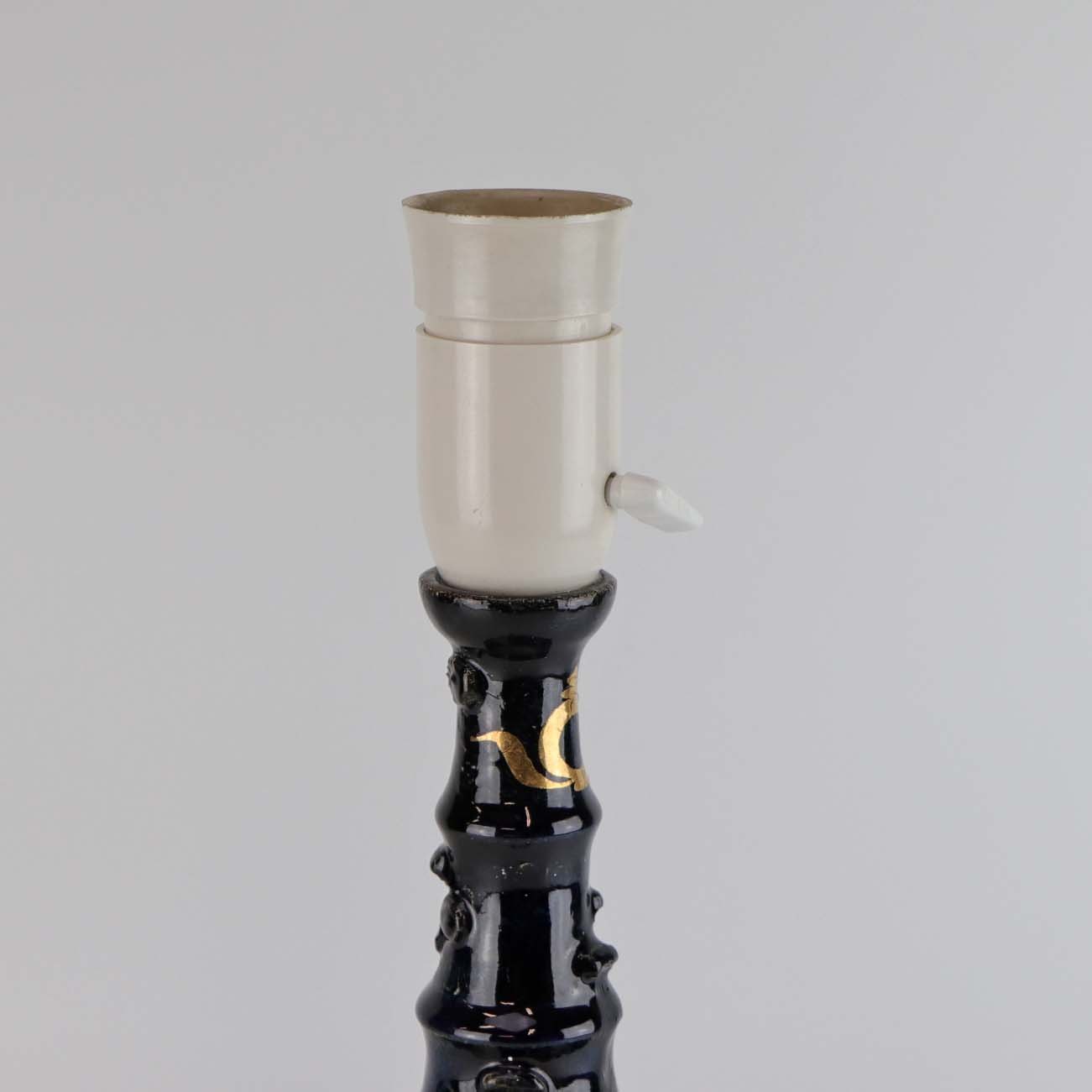 Lampefod i keramik med mørk glasering og dekoration af blomster og abstrakte gyldne motiver. Ledningen er opbevaret indeni foden.