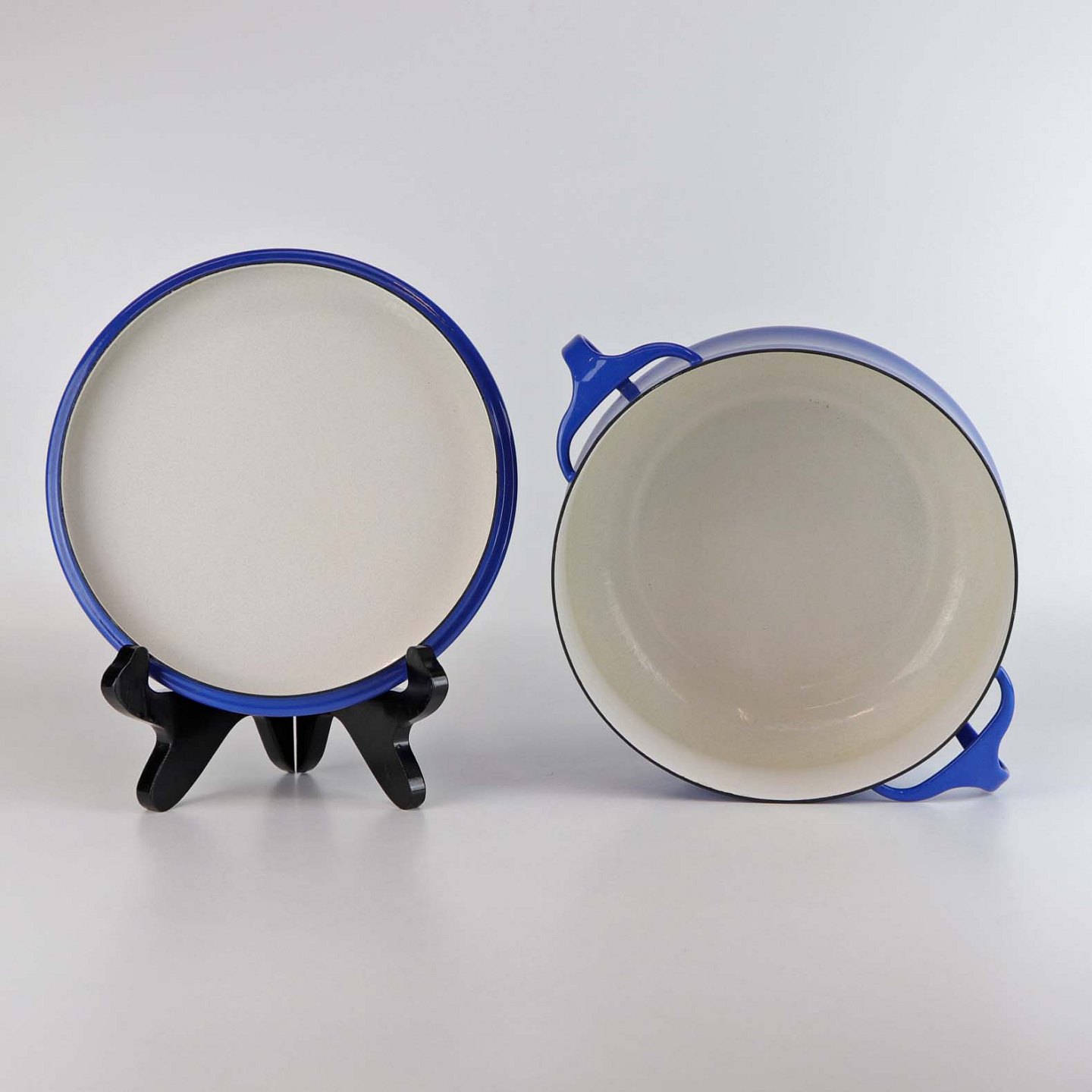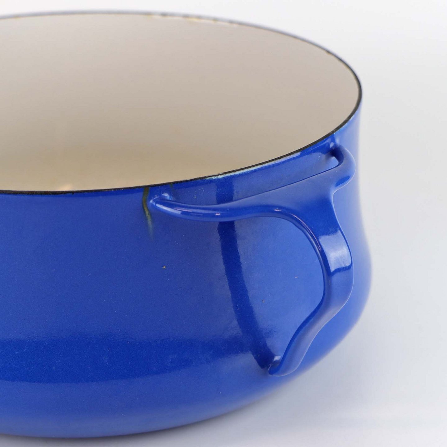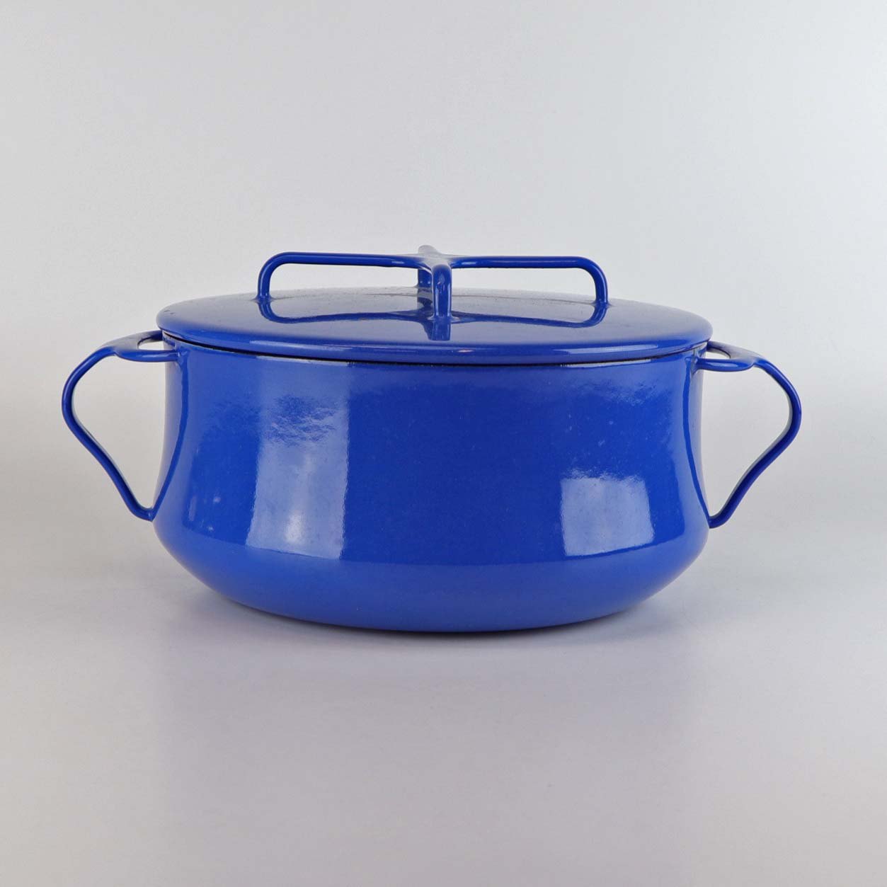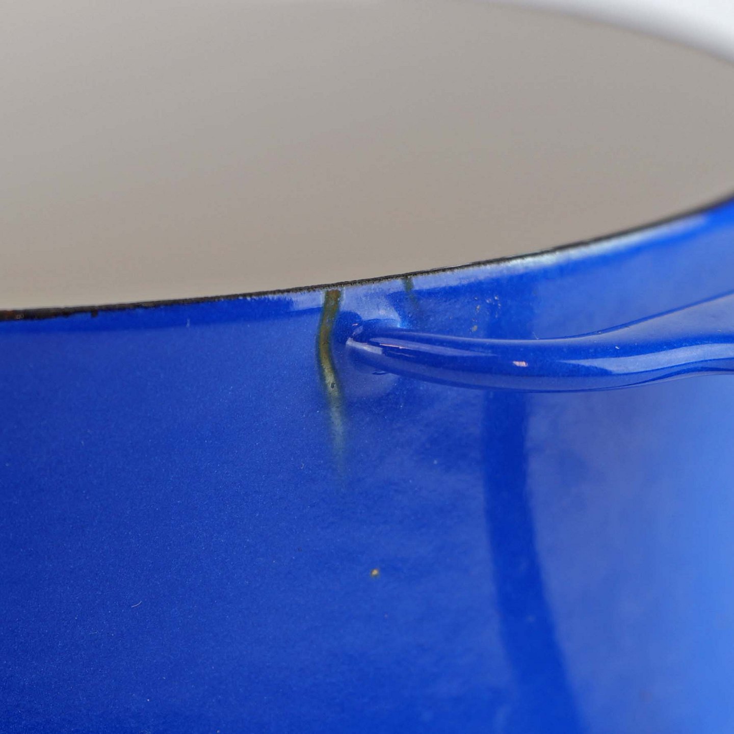 Kasserolle med låg fra serien Kobenstyle fremstillet i metal og belagt i blå og hvid emalje. Model France