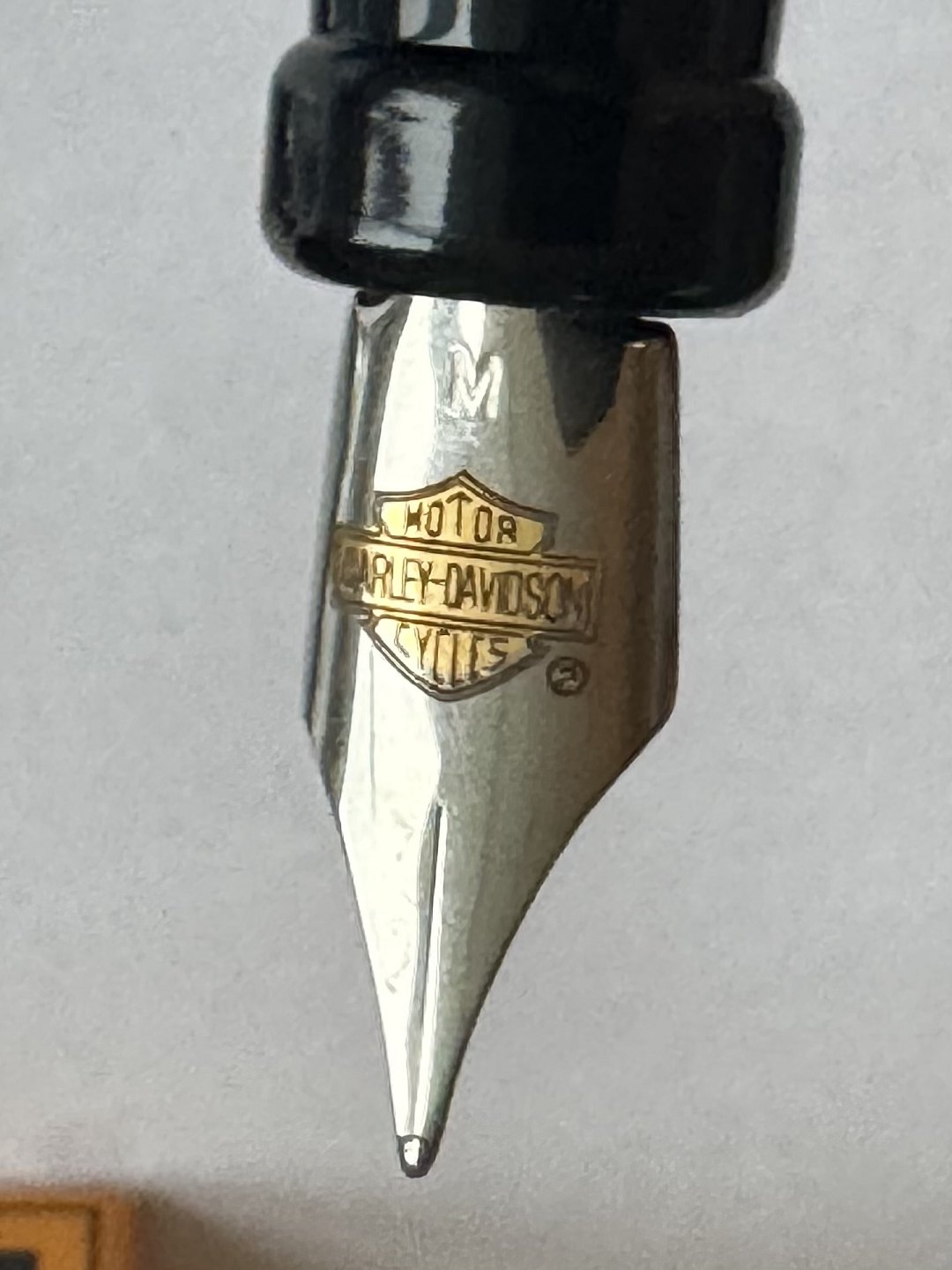Metallic gray Harley Davidson fountain pen set with ballpoint pen in original box. Both pens appear to be in good condition with no damage or repairs. The ballpoint pen writes fine with an old refill inside. The fountain pen is to be used when a new ink cartridge is inserted. All parts original in this H. D. writing set including the box. The fountain pen is 12 cm long.