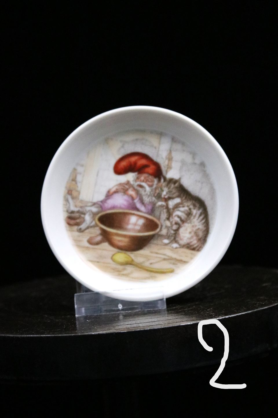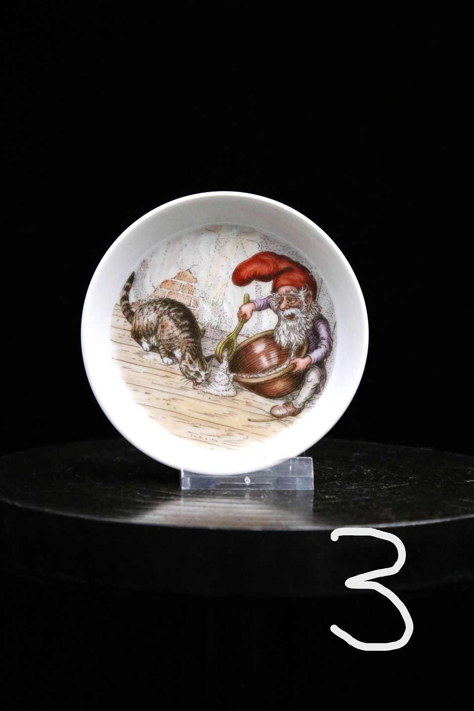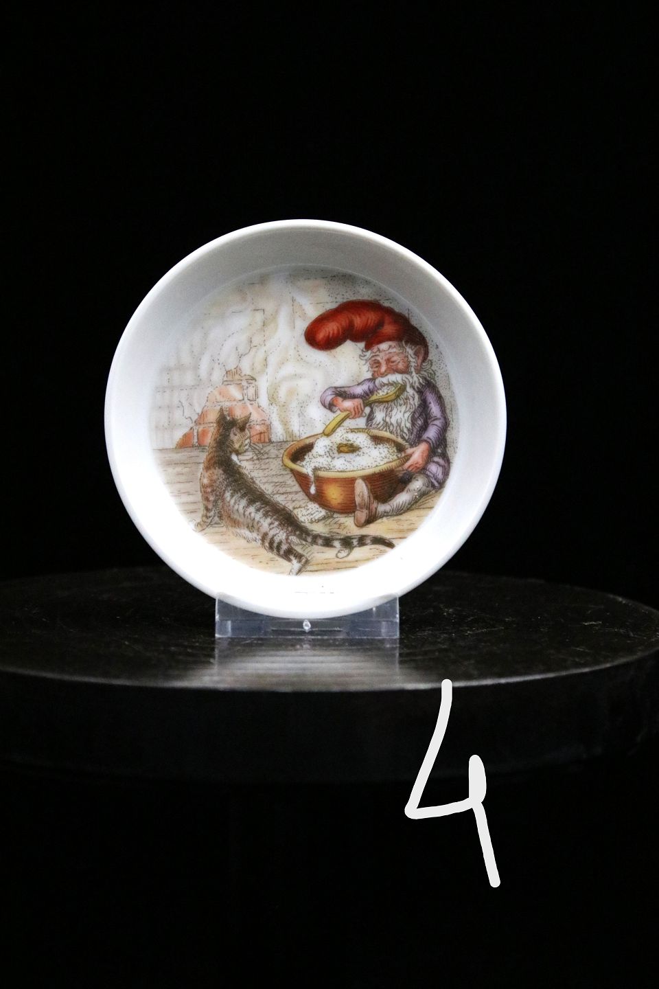 Royal Copenhagen glass / bottle tray in porcelain with various Christmas motifs of a gnome and a cat eating rice porridge. Dia.: 9cm.