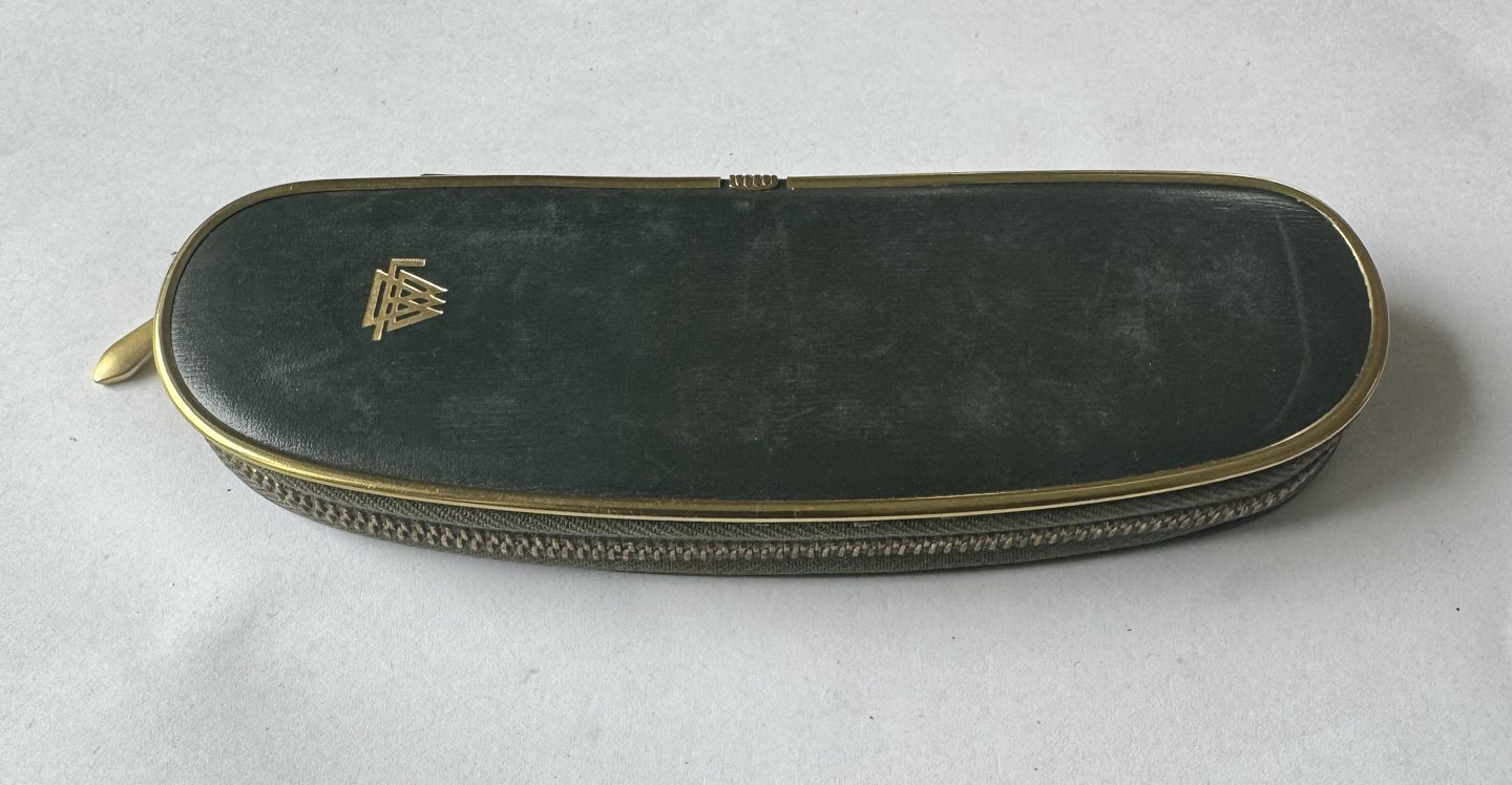 Pelikan fyldepennesæt i originalt futteral med logo fra Det Tyske Fodboldforbund. Fyldepennen en grønstribet Pelikan 400, der fremstår i god stand. Piston filler. Klar til at blive brugt. Tilhørende grønstribet Pelikan 455 kuglepen. Der skal indsættes en ny refill før end den igen kan skrive. Begge penne i god stand uden skader eller reparationer. Fyldepennen er 13,2 cm lang