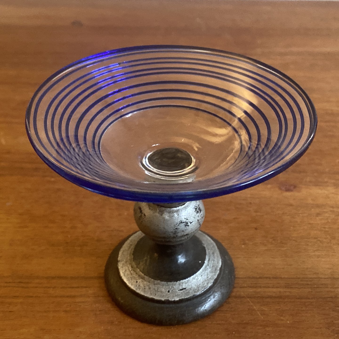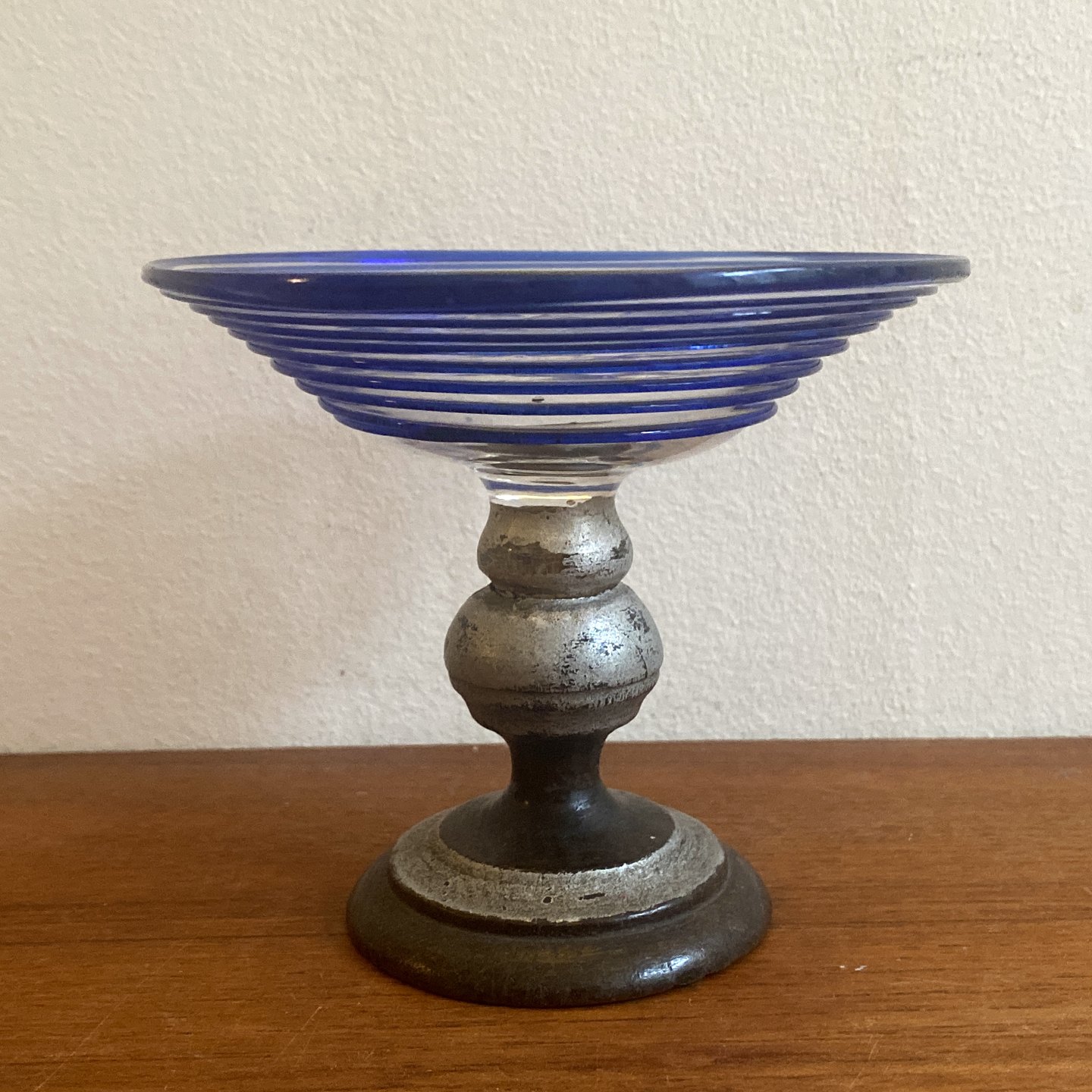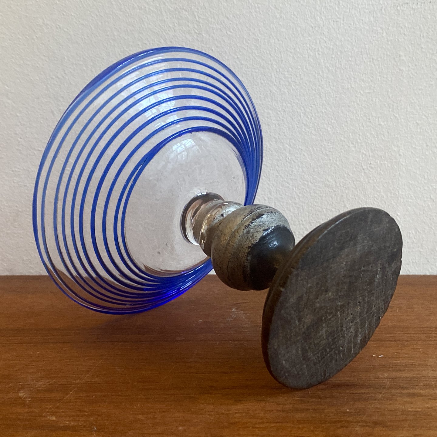 Bemalet stilk og fod. Halvdelen af stilken er af glas hvor sidste del af stilken og fod er af træ.
