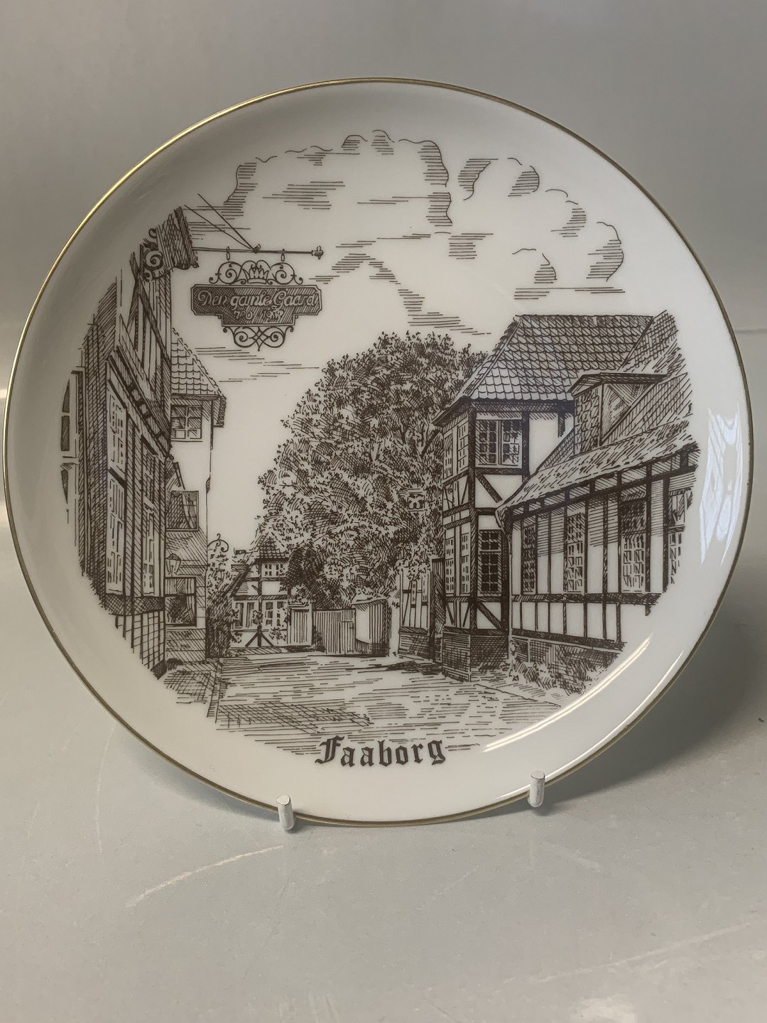 Flot platte fra Bing & Grøndal, med motiv af Faaborg, Den gamle gård. Platten er lavet med flot mørkebrun tegning, hvilket giver platten en følelse af "de gamle dage", og vil kunne passe i en samling eller som dekoration på væggen.