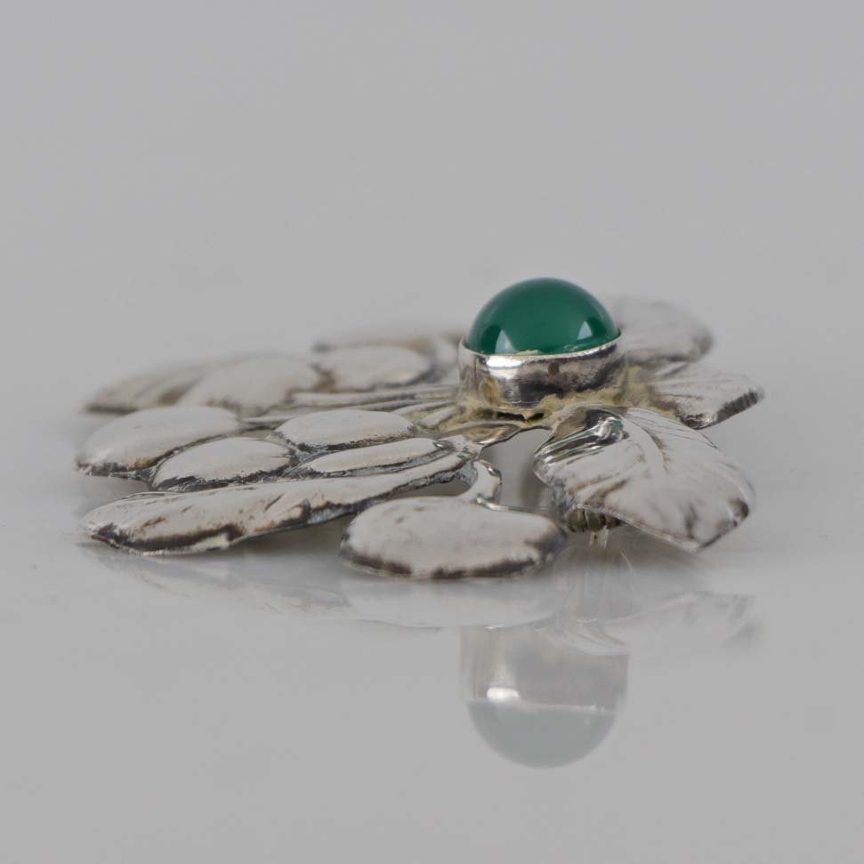 Broche i sølv udformet i skønvirke stil dekoreret med sten af grøn krysopras og motiv af blade og bær