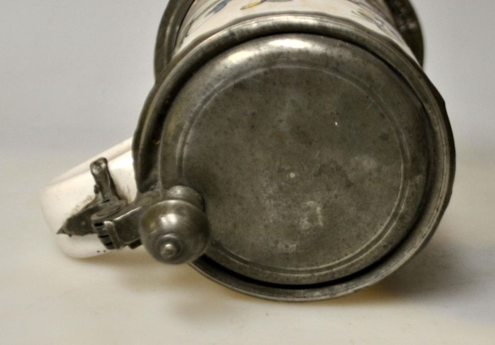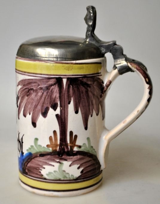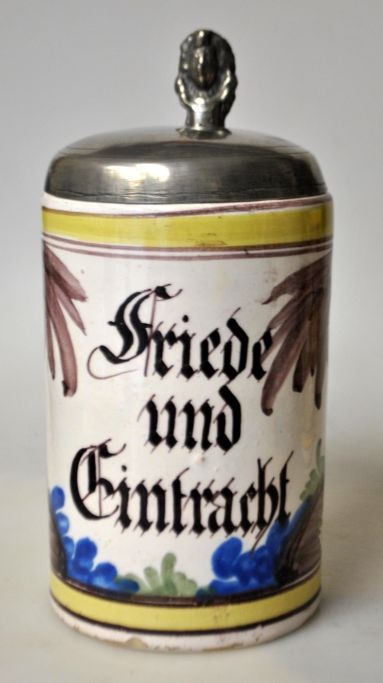 Ølkrus, fajance, Hannoversch Münden, ca.. 1830, Tyskland. Polykrom dekoration med tysk tekst: "Friede und Eintracht". I bunden signeret. Tinlåg med løve. Stemplet. Med hank.. H.: 19  cm.
