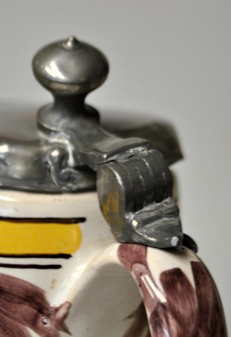 Ølkrus, fajance, Hannoversch Münden, ca.. 1830, Tyskland. Polykrom dekoration med ged.Tinlåg. Stemplet. Med hank.. H.: 18  cm.