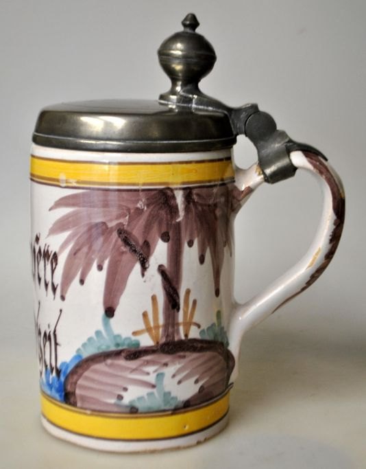 Beer mug, faience, Hannoversch Münden, 1848, Germany. Polychrome decoration with German text: Auf unsere Gesundheit. Pewter lid with initials: D.E.R 1848..With handle.. H.: 22 cm.
