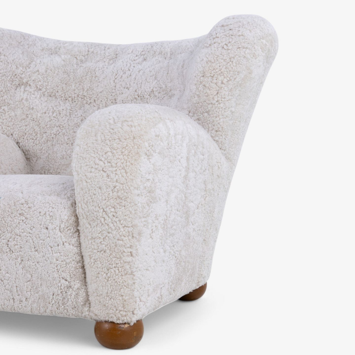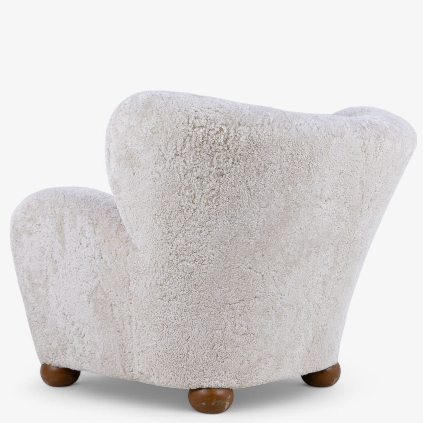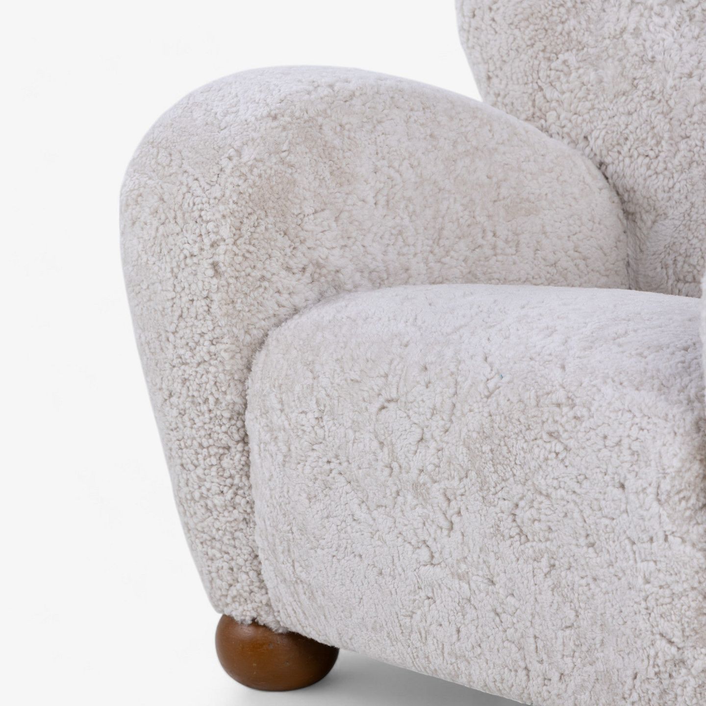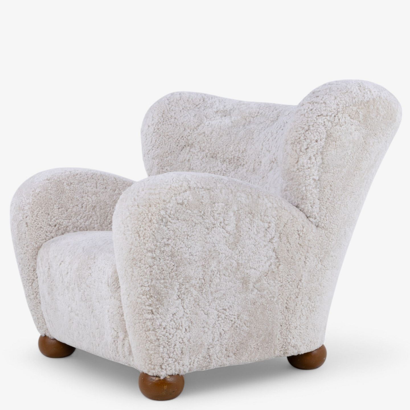 Sjælden 'Aulanko'-lænestol i nyt lammeskind (farve: Moonlight). Formgivet c. 1939 til Hotel Aulanko i Finland.