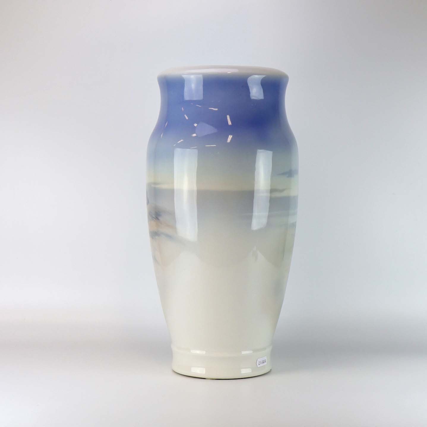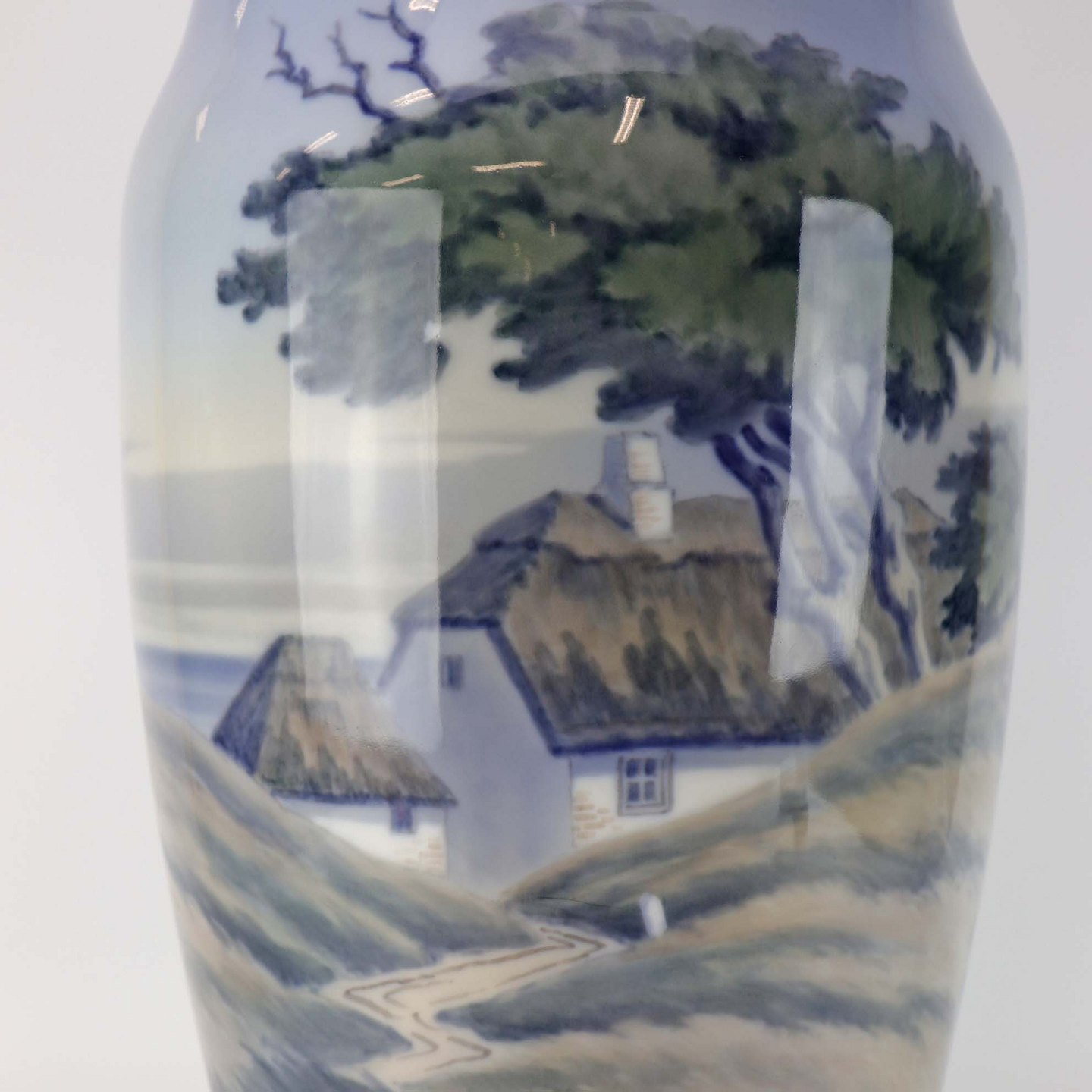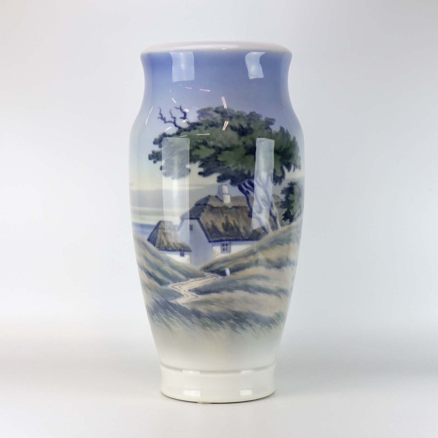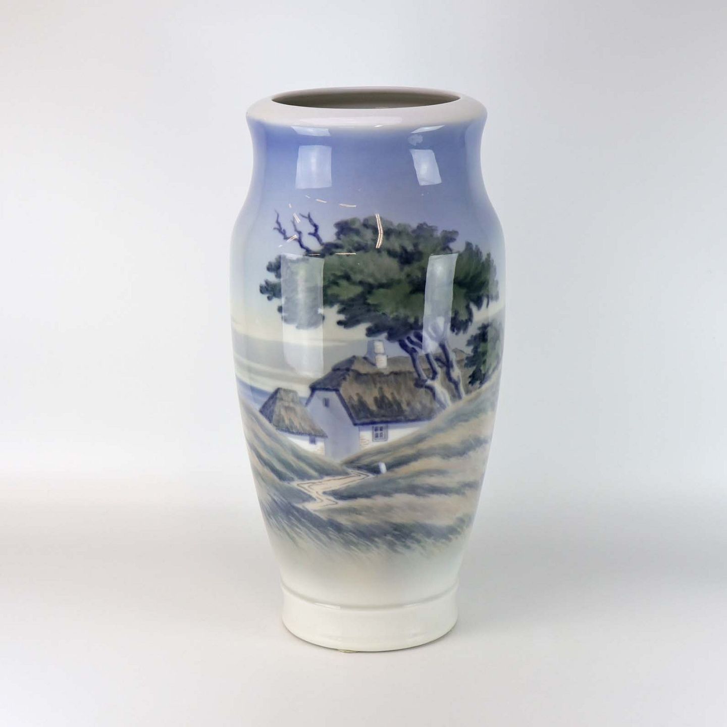 Gulvvase i porcelæn med motiv af stråtægte huse i klitmiljø. Nr. 2854/131