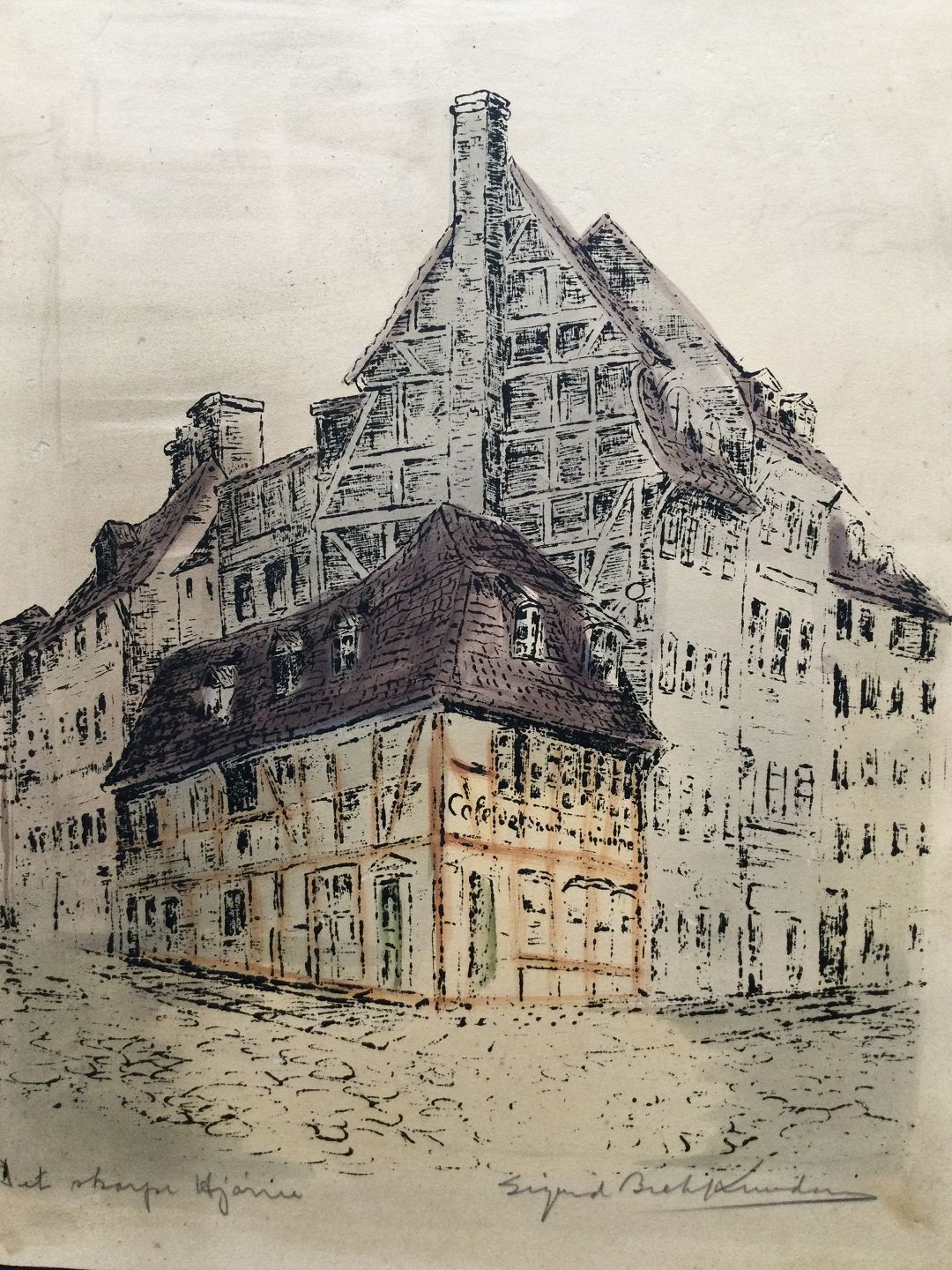 Litografi af Sigrid Bech-Knudsen - Café "Det Skarpe Hjørne" København.