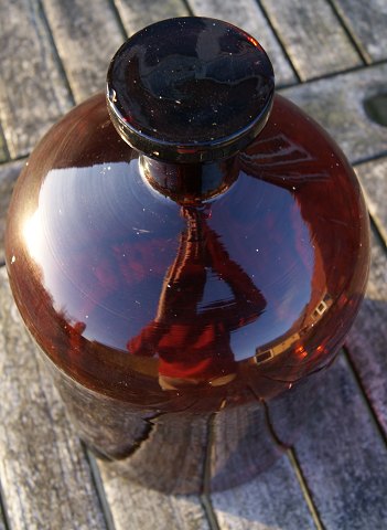 Stor og velholdt apotekerflaske i mørkebrunt glas.
