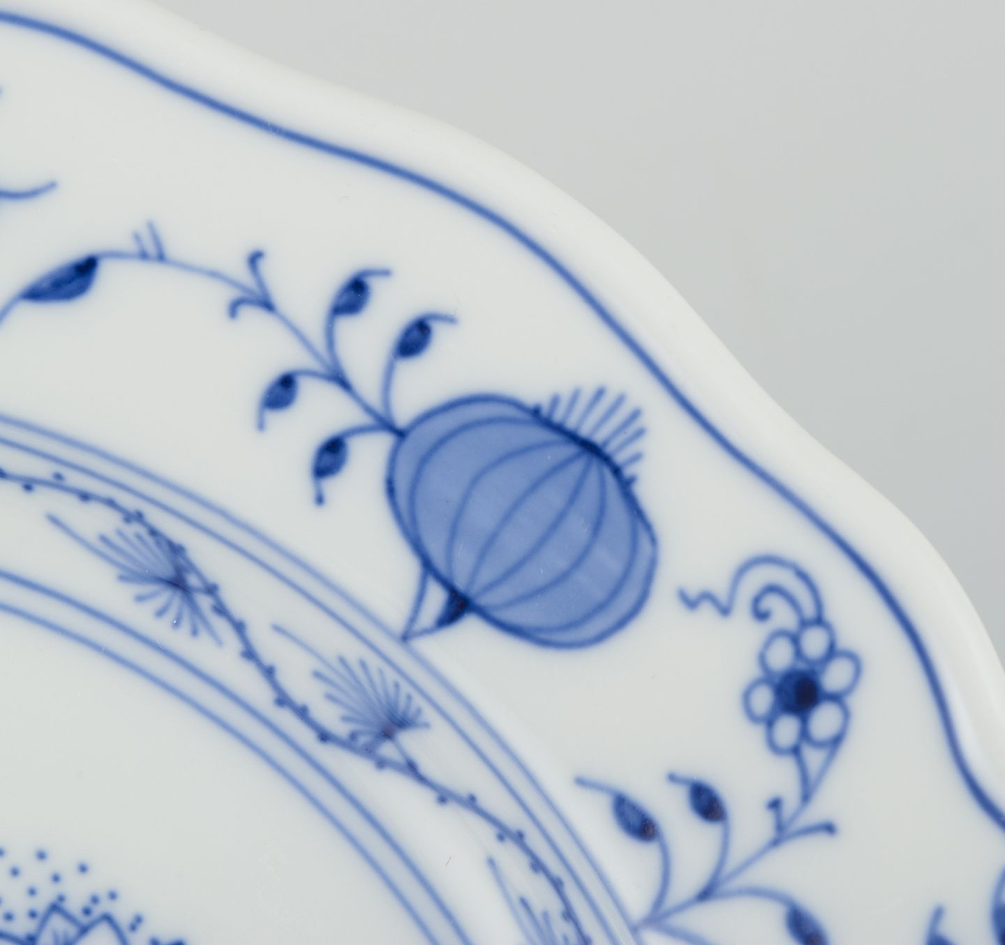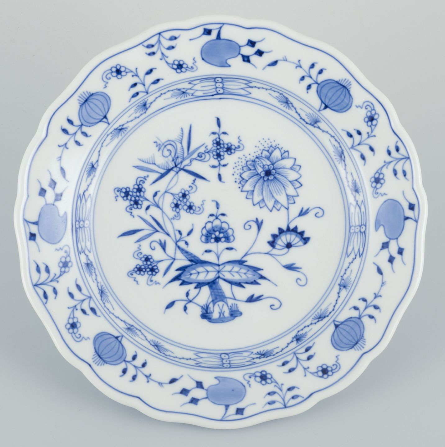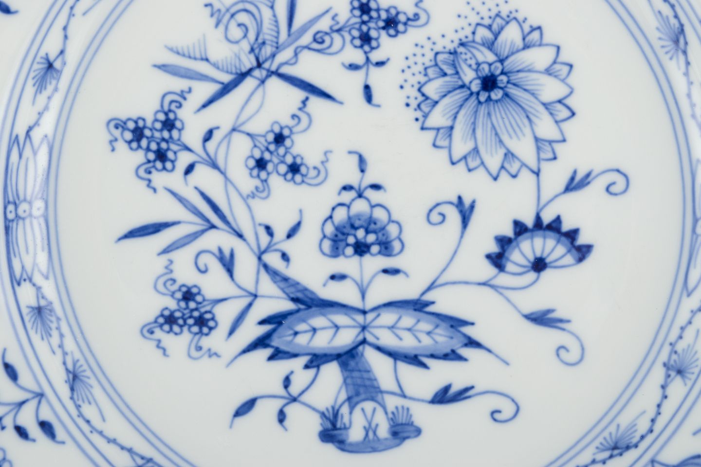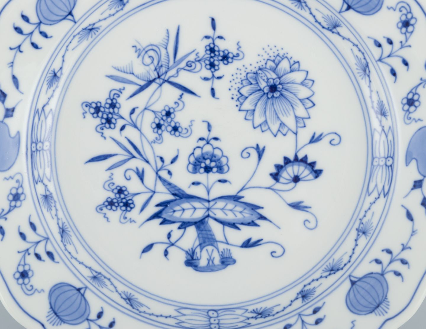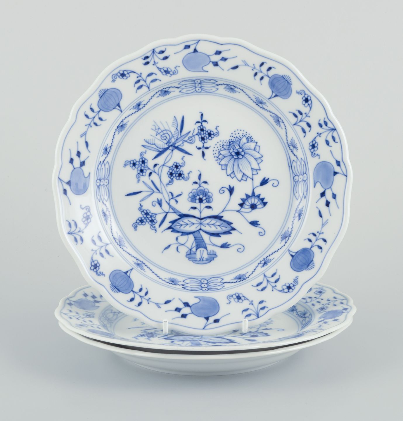Meissen, tre løgmønstrede tallerkner i blåmalet porcelæn.