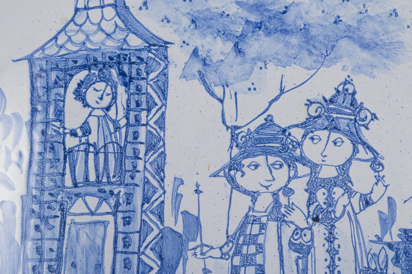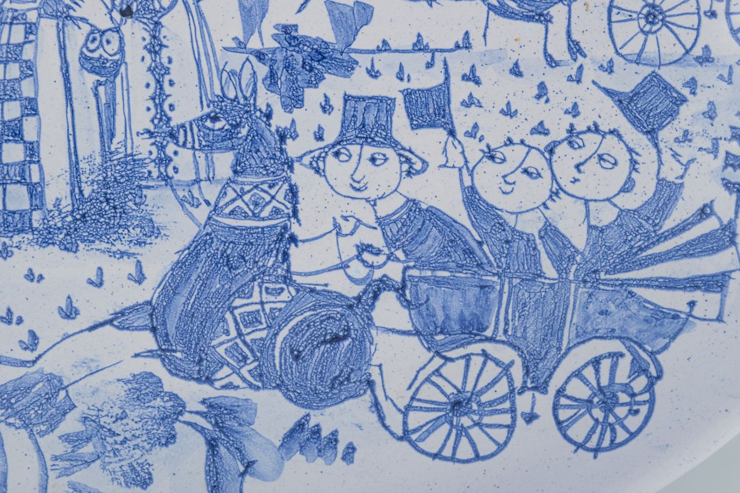 Stor oval keramikskål håndmalet i blåt. Motiv af gæster i hestevogn på vej til fest på slottet.