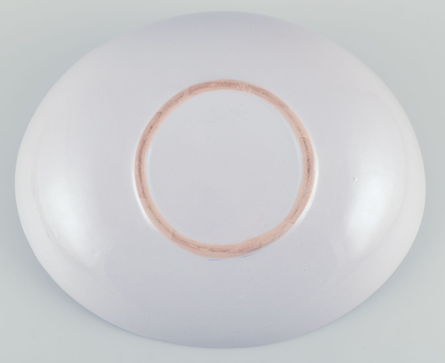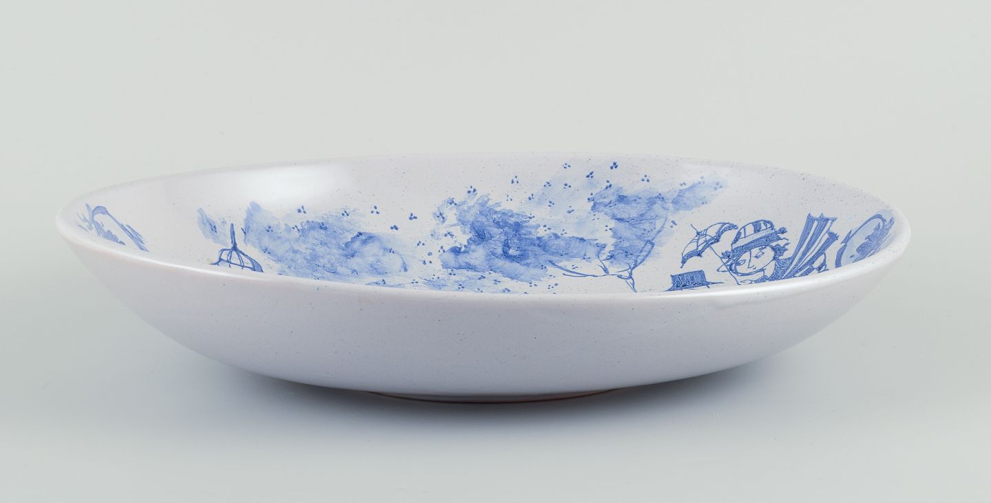 Stor oval keramikskål håndmalet i blåt.