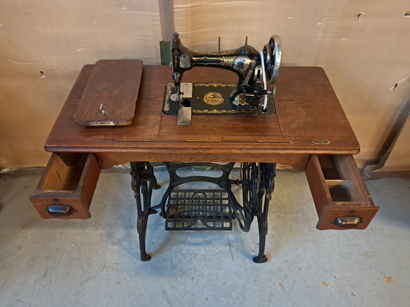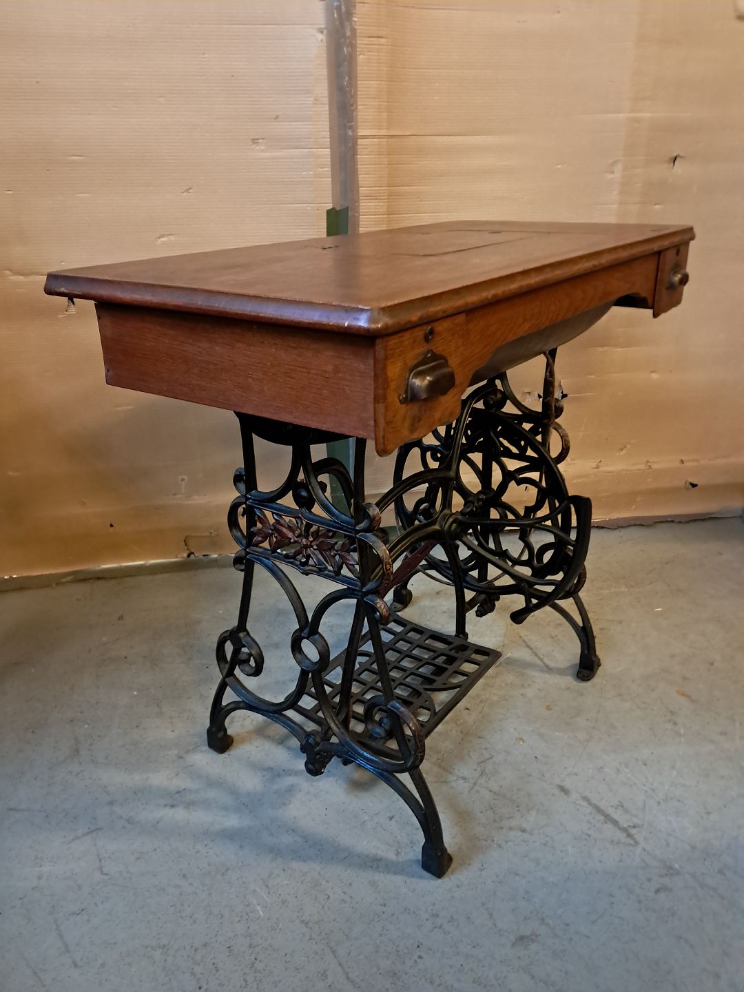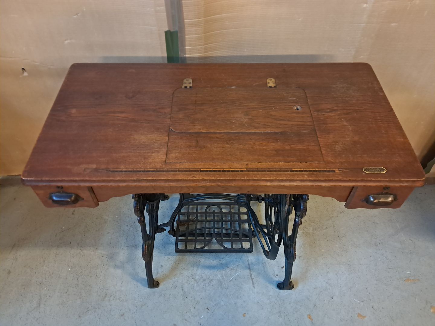 Sybord i fineret egetræ og metal, fra 1910erne.