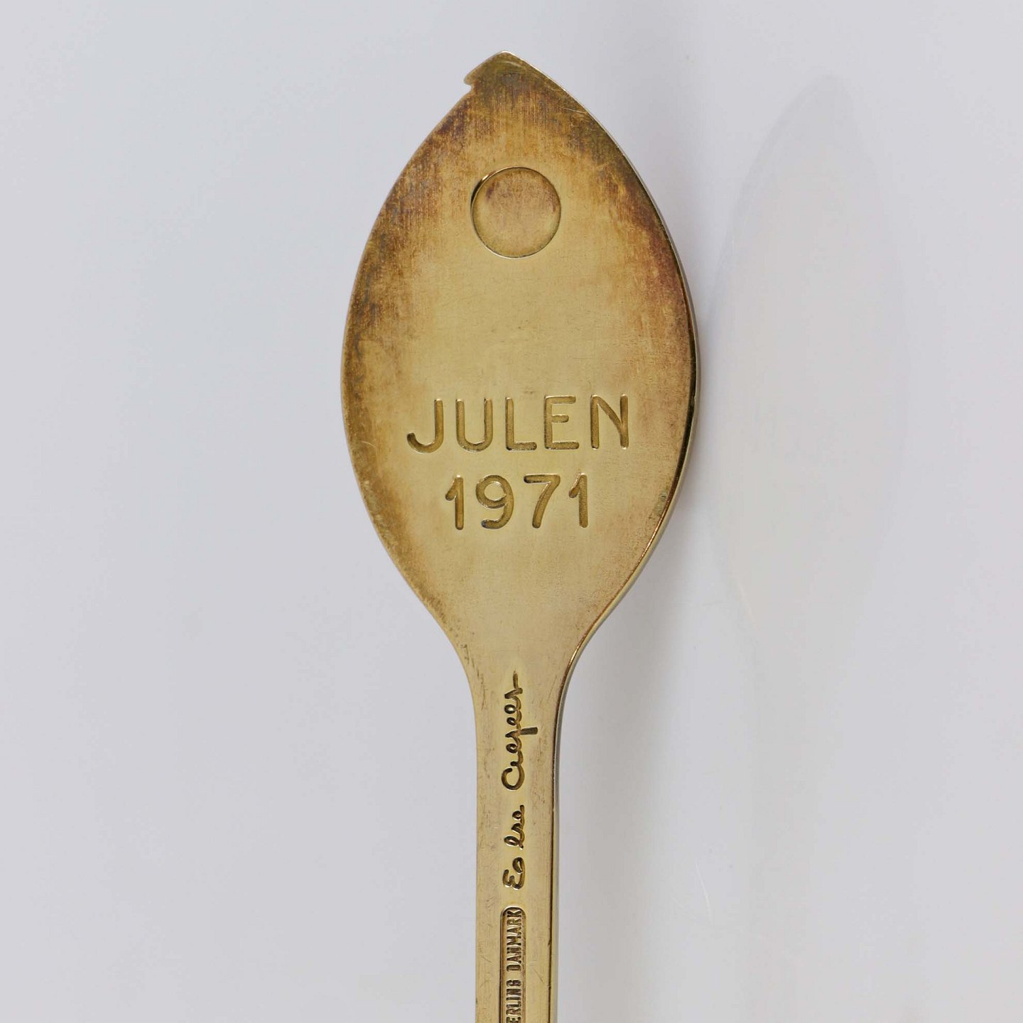 Julegaffel i forgyldt sterling sølv med indlagt emalje med teksten Jul 1971 og motiv af gyldent univers