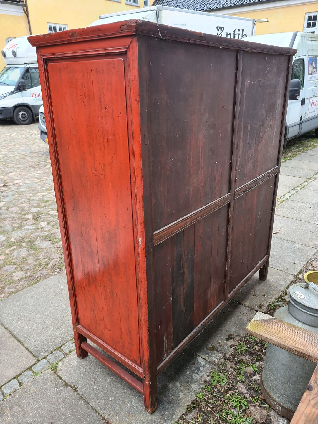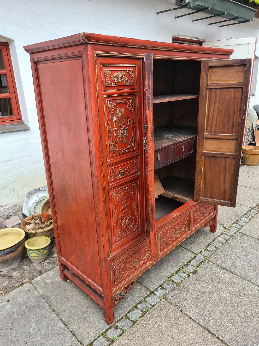 Kinesisk dækketøjsskab i original rød bemalet træ.