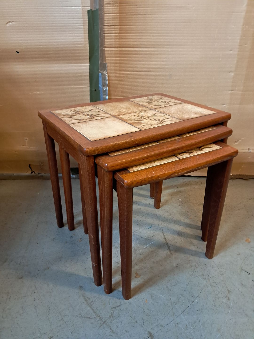 3 Indskudsborde i massivt teaktræ med kakler, fra 1970erne.