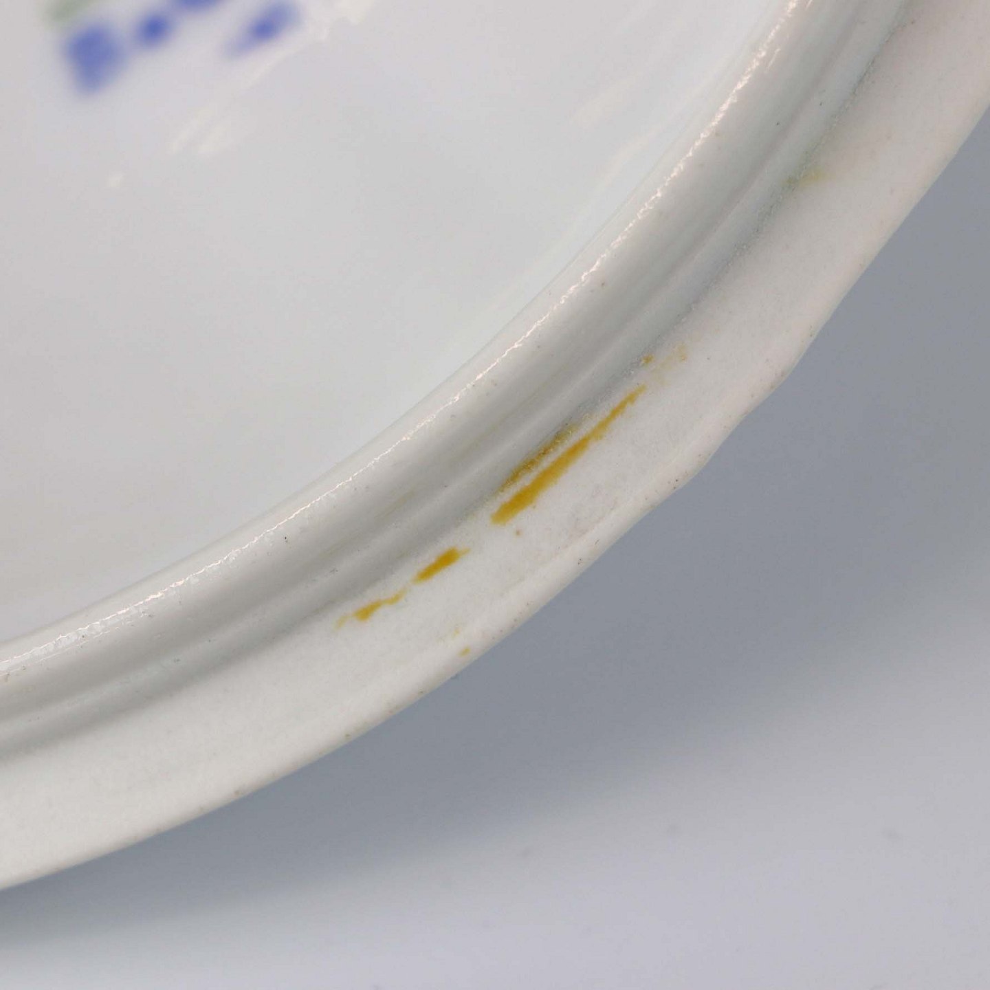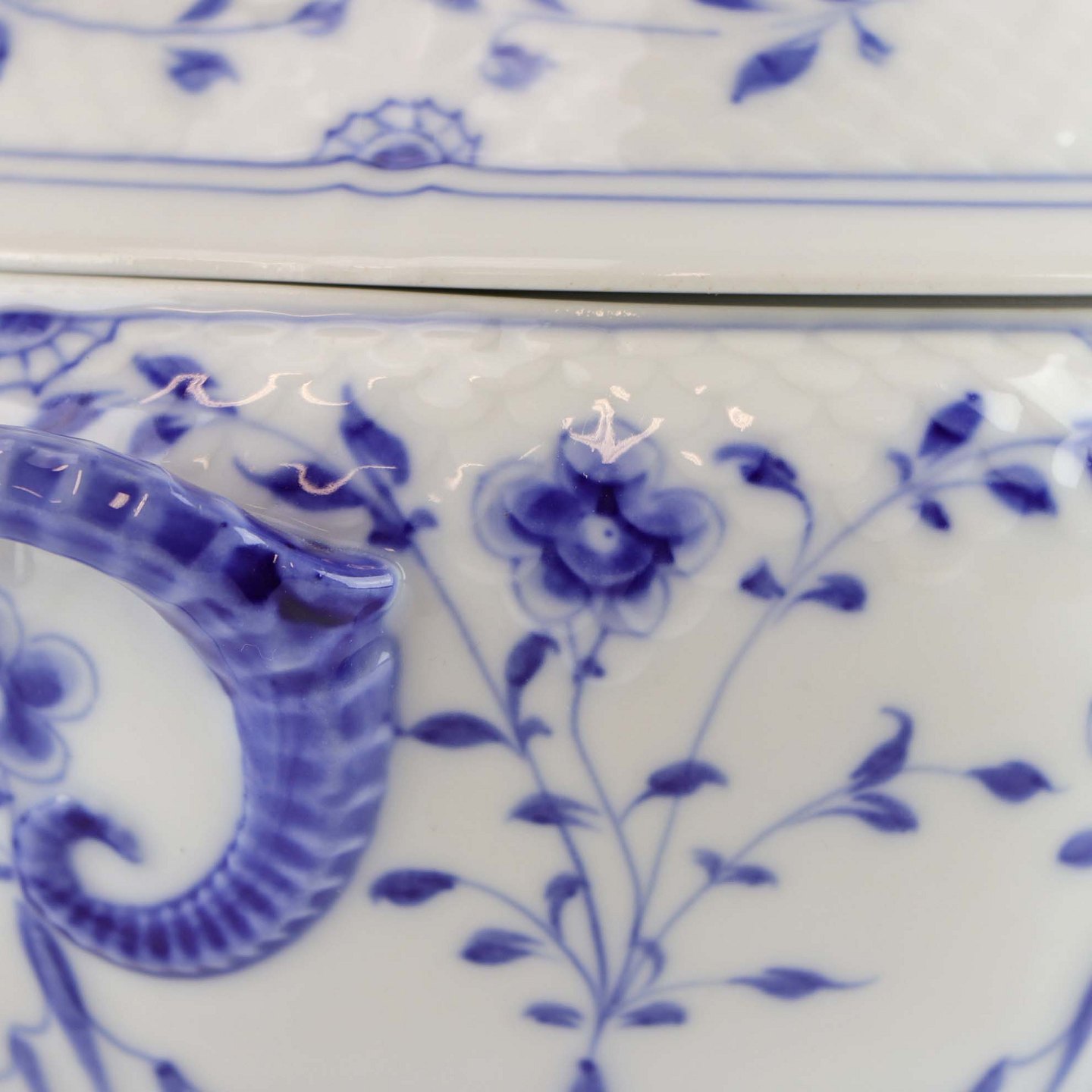 Service i hvidt skælformet porcelæn med blå motiver af blomster og sommerfugle.