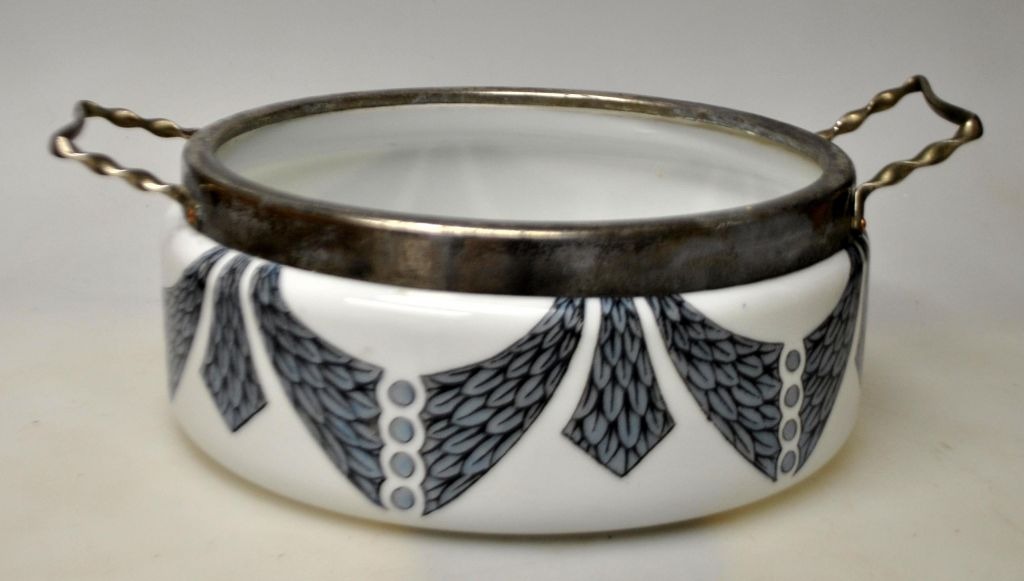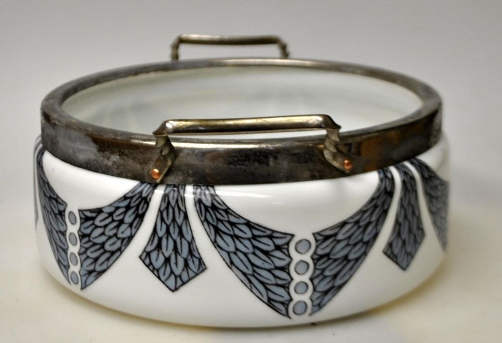 Bordskål, Fyns Glasværk, opalhvid glas med påbrændt dekoration, 1910. Dekoration med kontur som overføringsbillede. Med nummer: 266/429. Med metalbeslag i forsølvet nikkel med to hanke. Dia: 19 cm. uden hanke. H.: 7,6 cm.