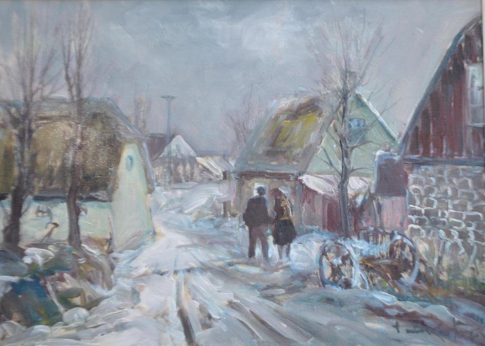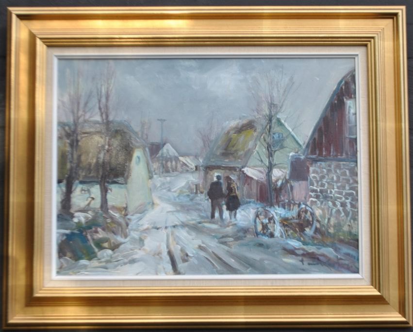 Kastrup, Poul (1920 - 1987) Denmark: Two people on a road. Winter. Oil on canvas. Signed. 40 x 55 cm.