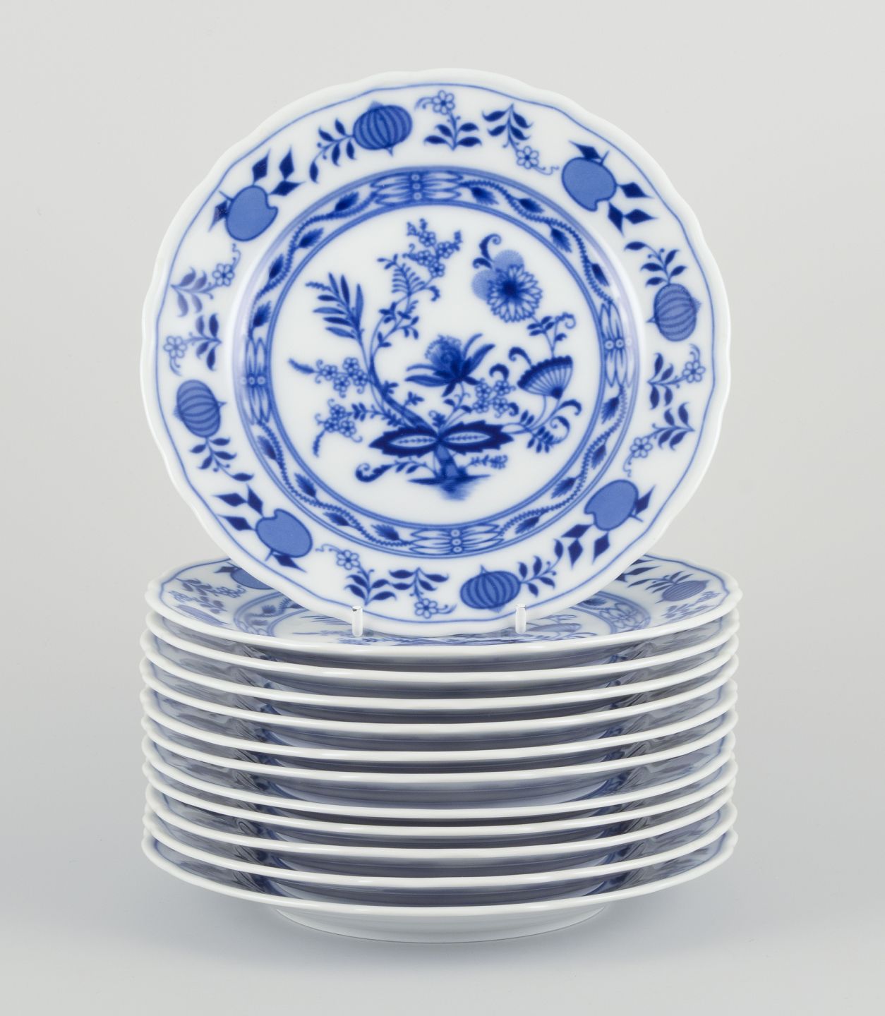 Et sæt på tolv porcelænstallerkener, løgmønster.