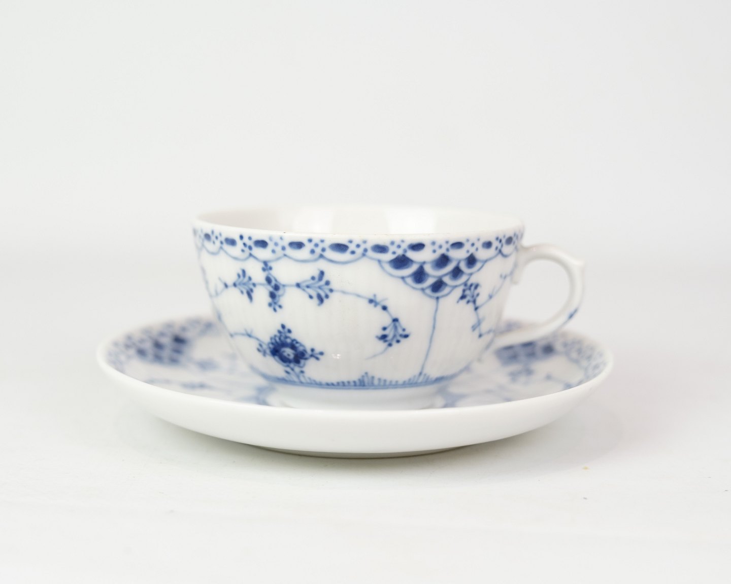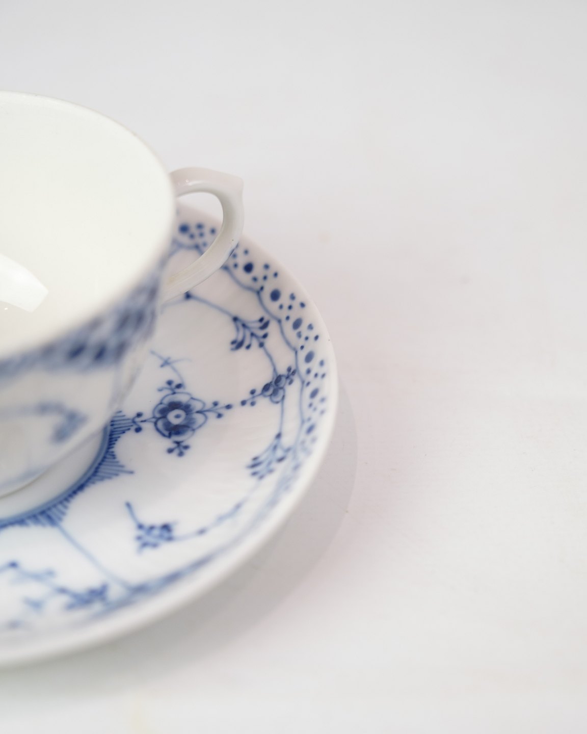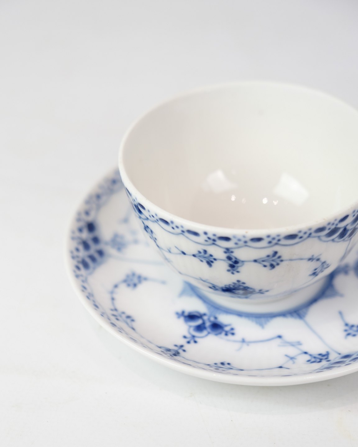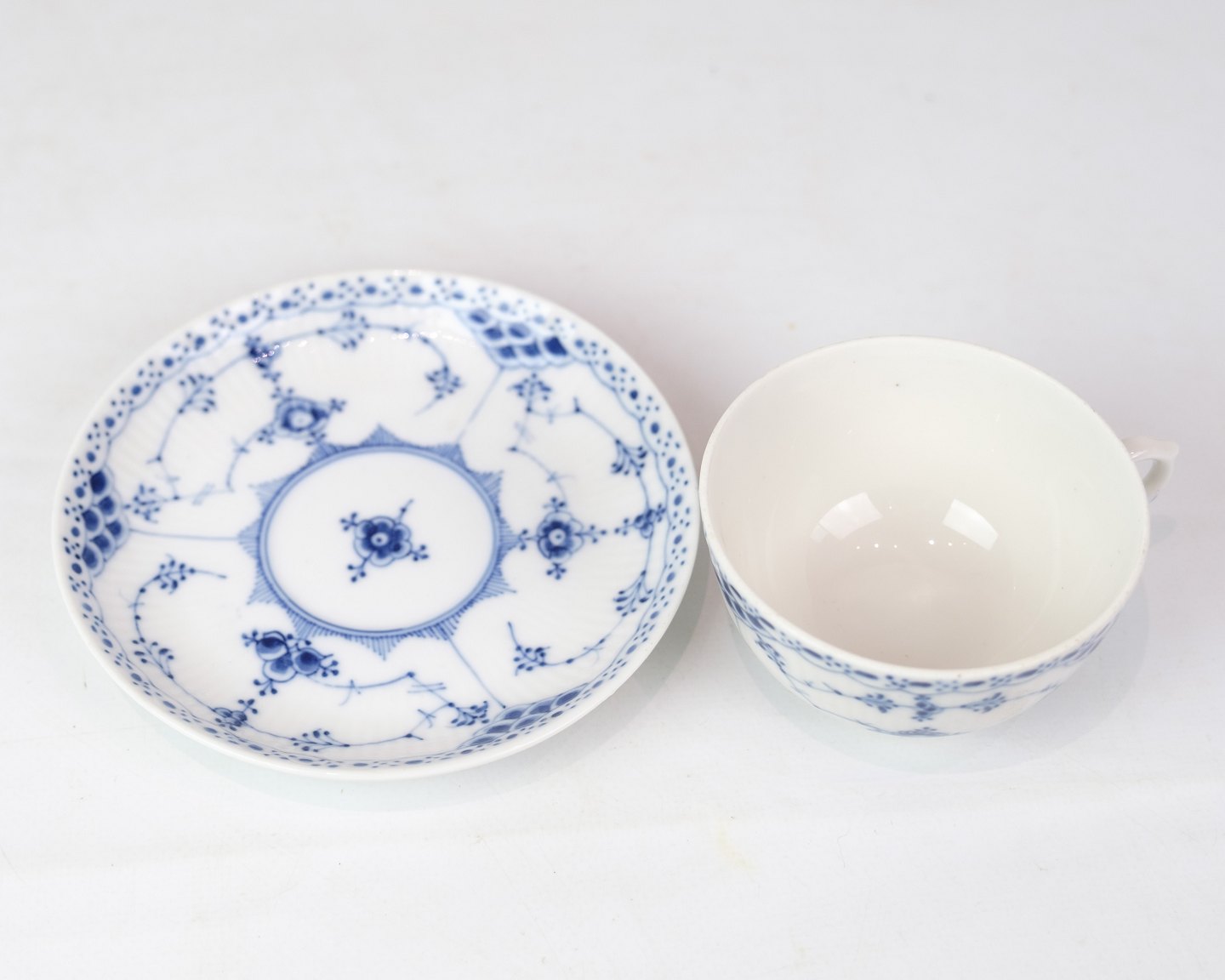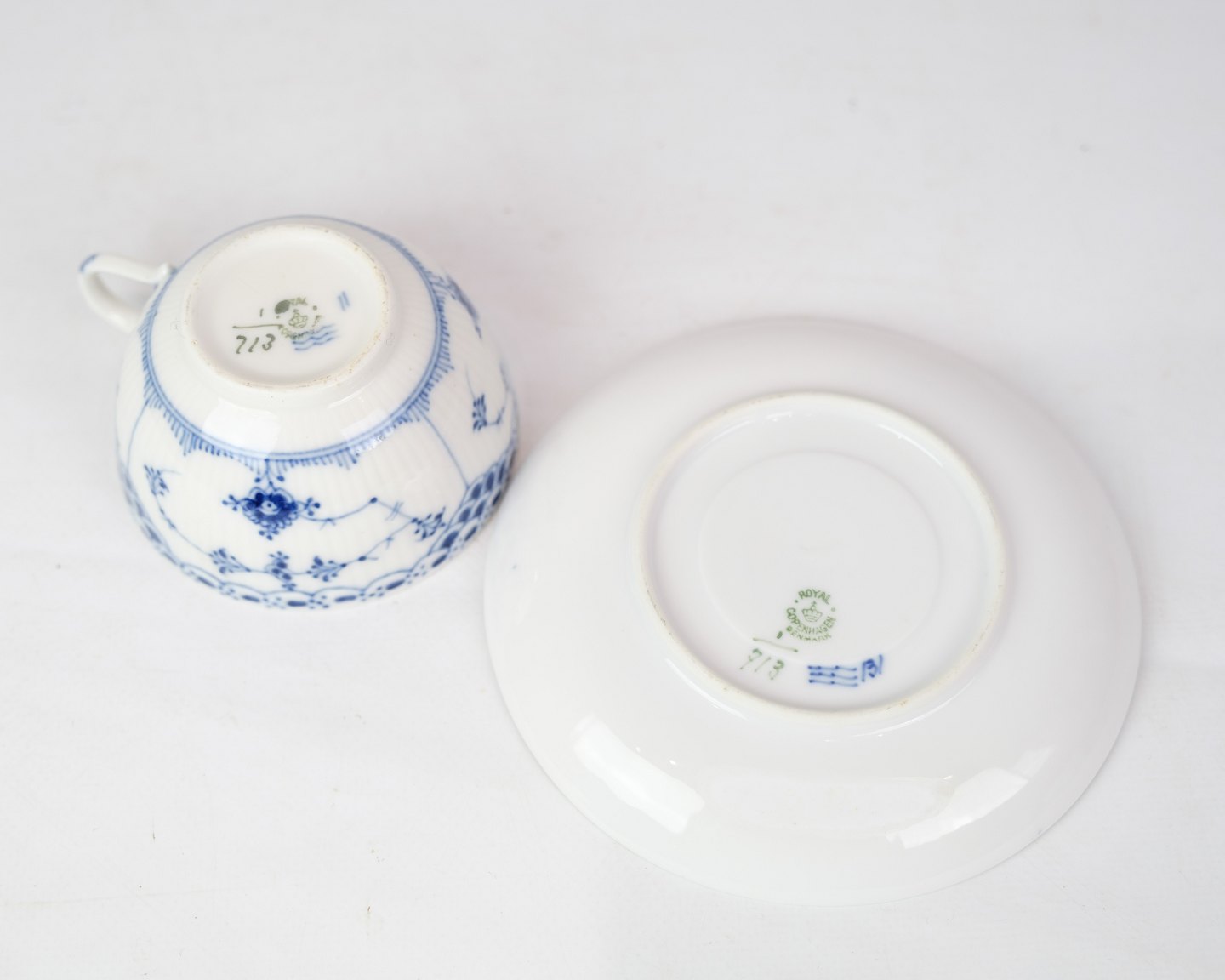 Teacup and saucer marked no. 1/713 from Royal Copenhagen. 1. Sorting in half lace blue fluting design. Designed by Arnold Krog.