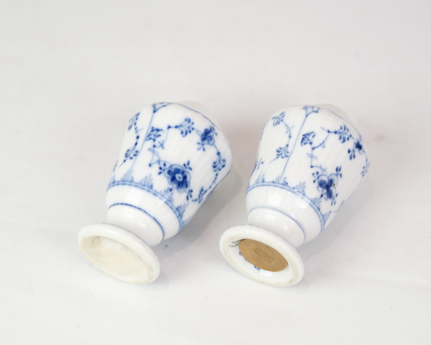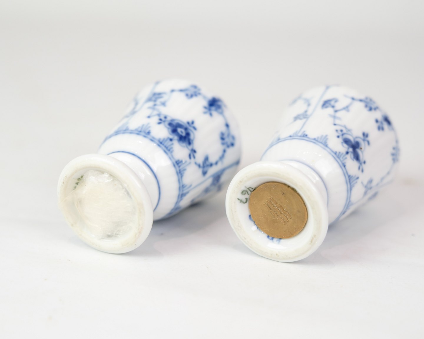 Salt og peberbøsse mærket 1/467 fra Royal Copenhagen. I porcelæn med klassisk musselmalet riflet design. Håndmalet blå dekoration.