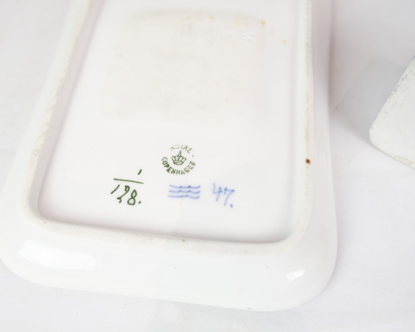RC skrivesæt i mønstret musselmalet riflet med model nr. 128. Med henblik på fabriksmærket fra den kongelige porcelænsfabrik fremgår det at denne vare er fremstillet i mellem 1898 og 1923. Står i meget pænt stand med tilhørende låg.