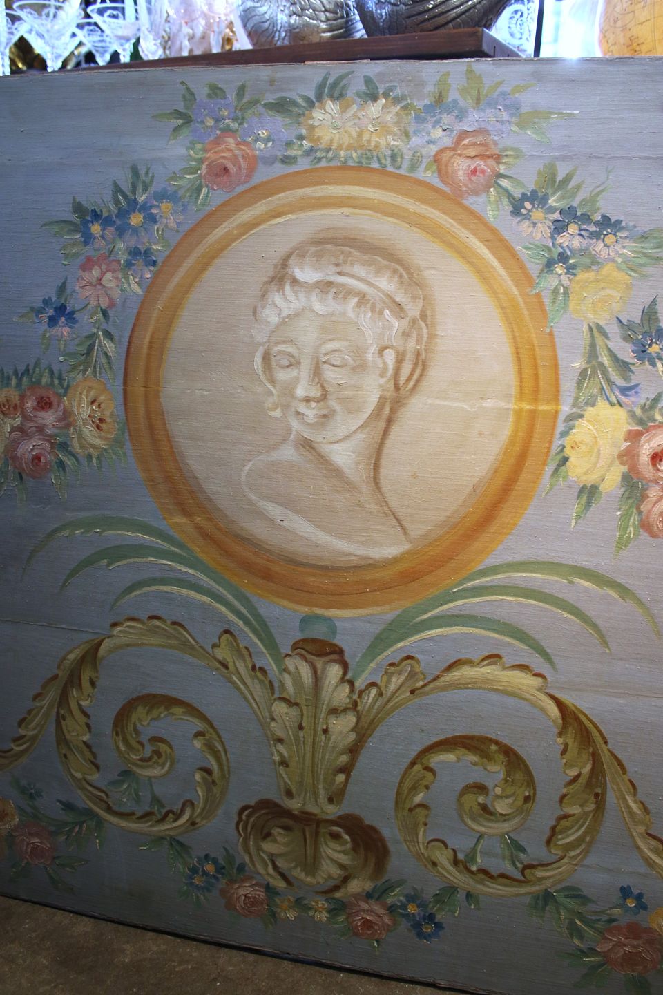 i fin lyseblå bundfarve med kvindeportræt i midten og fine blomsterranker. Måler: H: 85cm. B: 107,5cm.