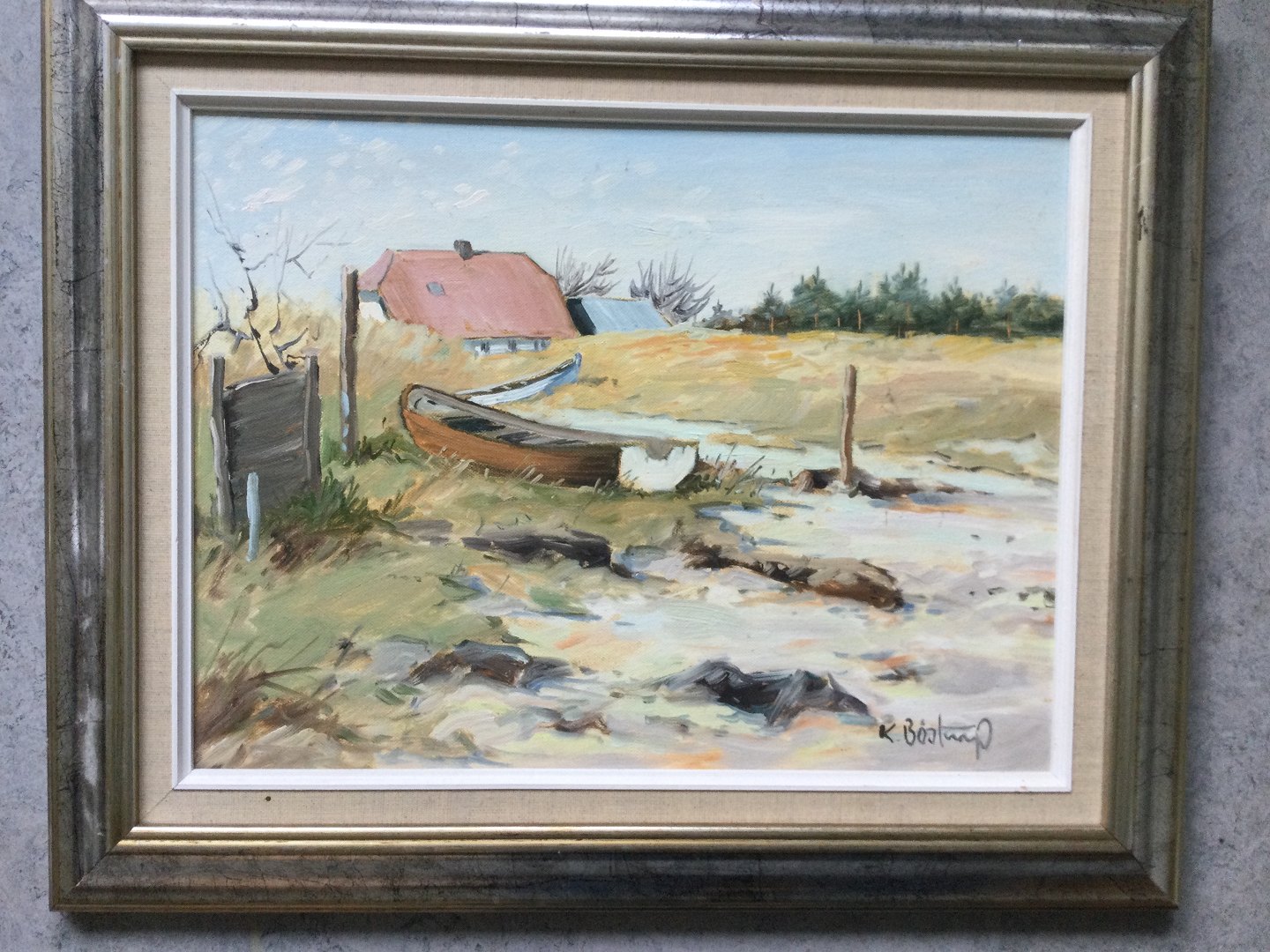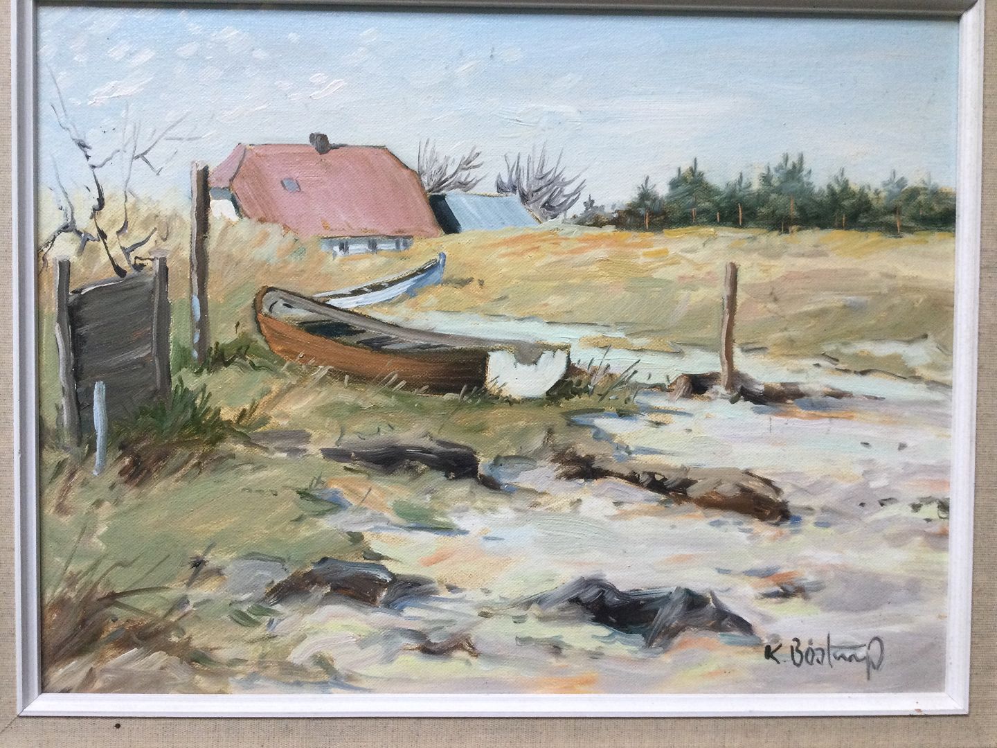 Maleri - Knud Bøstrup - Klitparti med båd og gård.