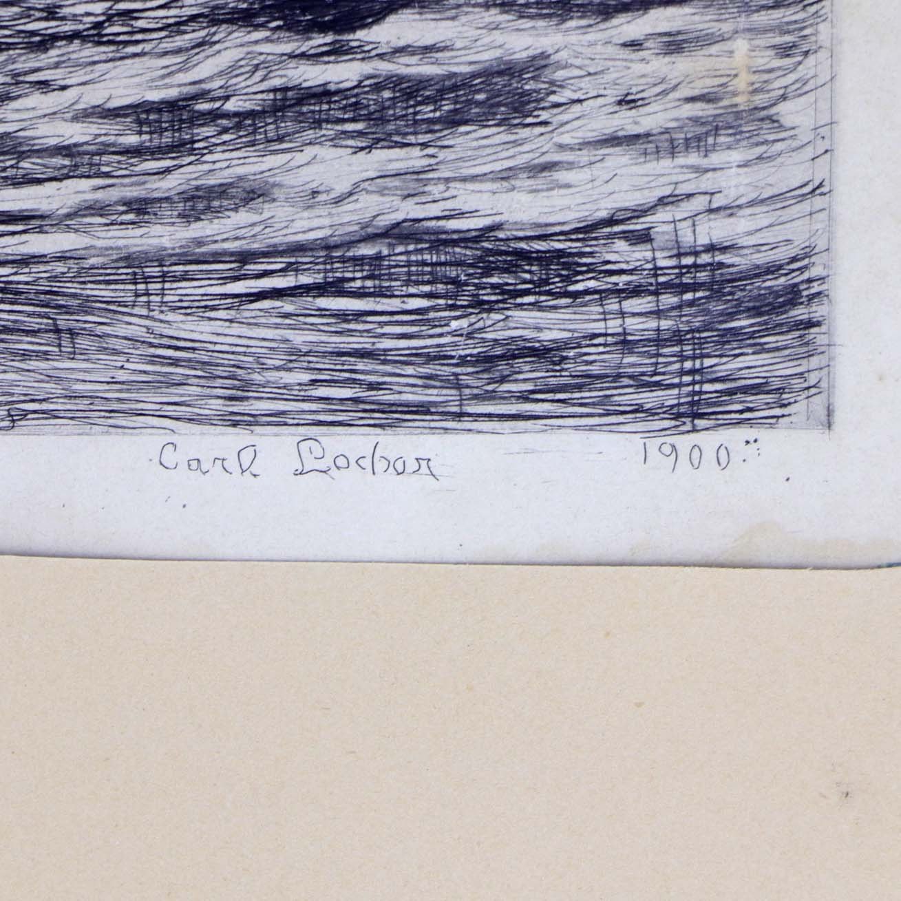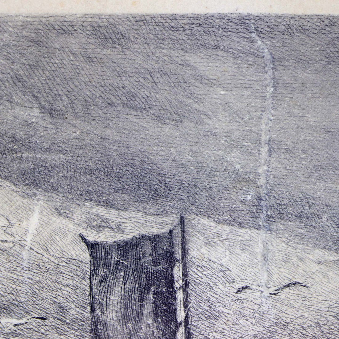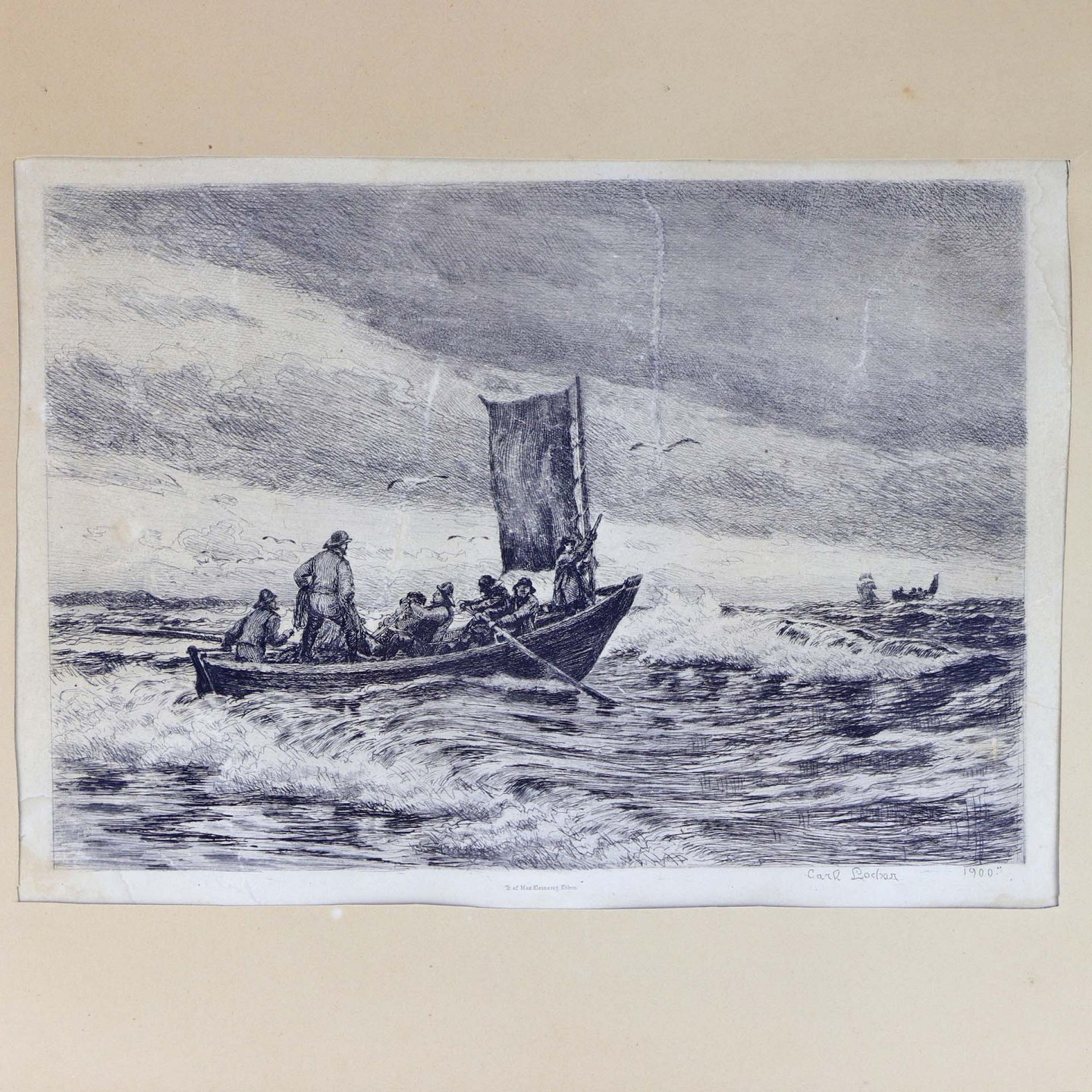 Indrammet radering med passepartout i træramme og havmotiv med redningsbåd på vej mod forlist skib.
