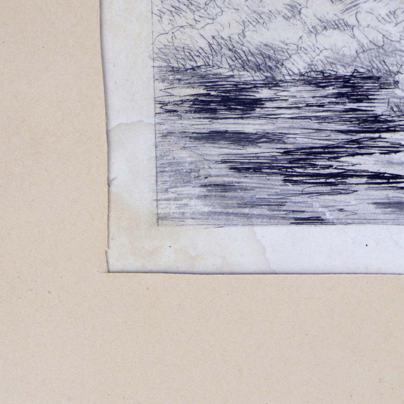 Fremstår med vandmærker på papiret og mindre brugsspor på rammen.