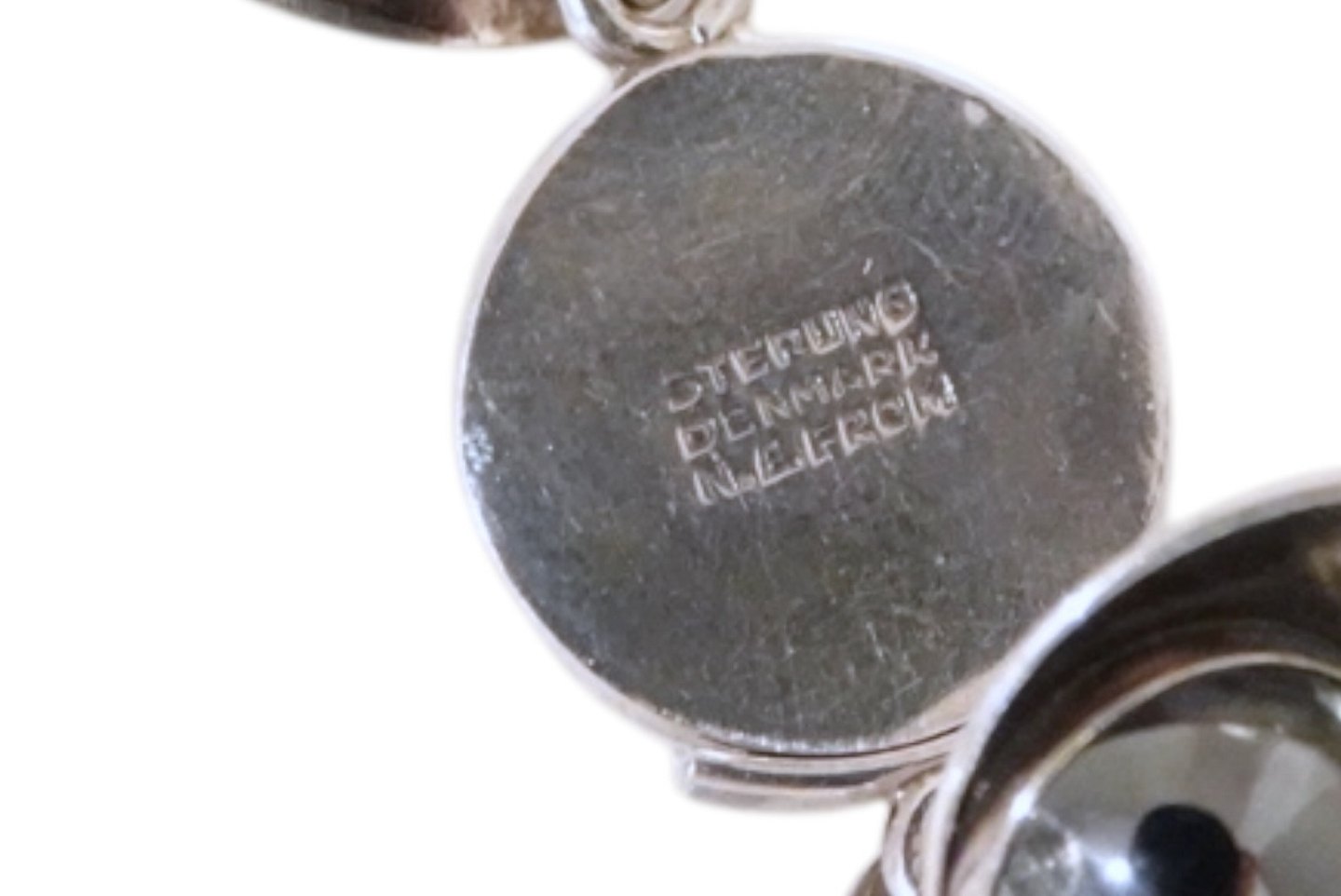 Stemplet "STERLING DENMARK N.E FROM". N.E. From var sølvsmed i Randers og Nakskov fra 1944 til 2009 og er kendt for at have lavet smykker i høj kvalitet.