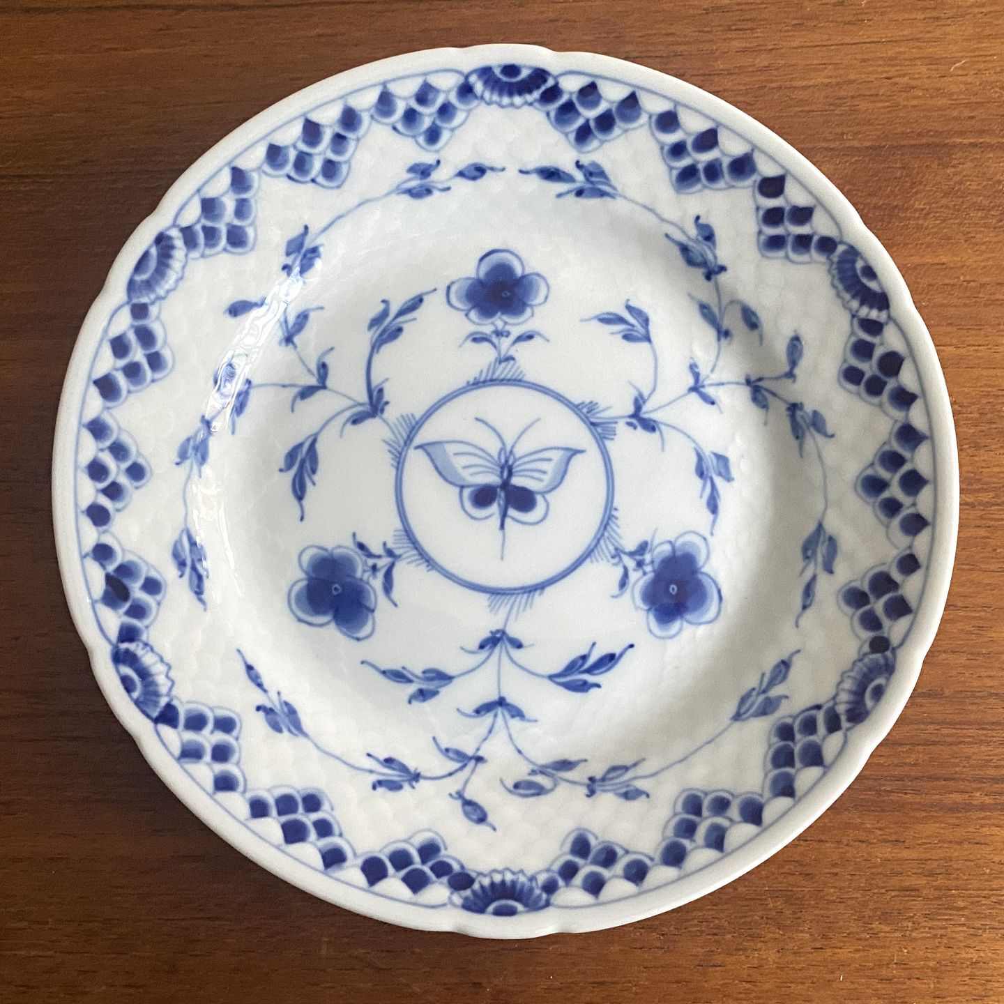 Blåmalet Dickens Sommerfugl halvblonde Musselmalet desserttallerken nr. 28.