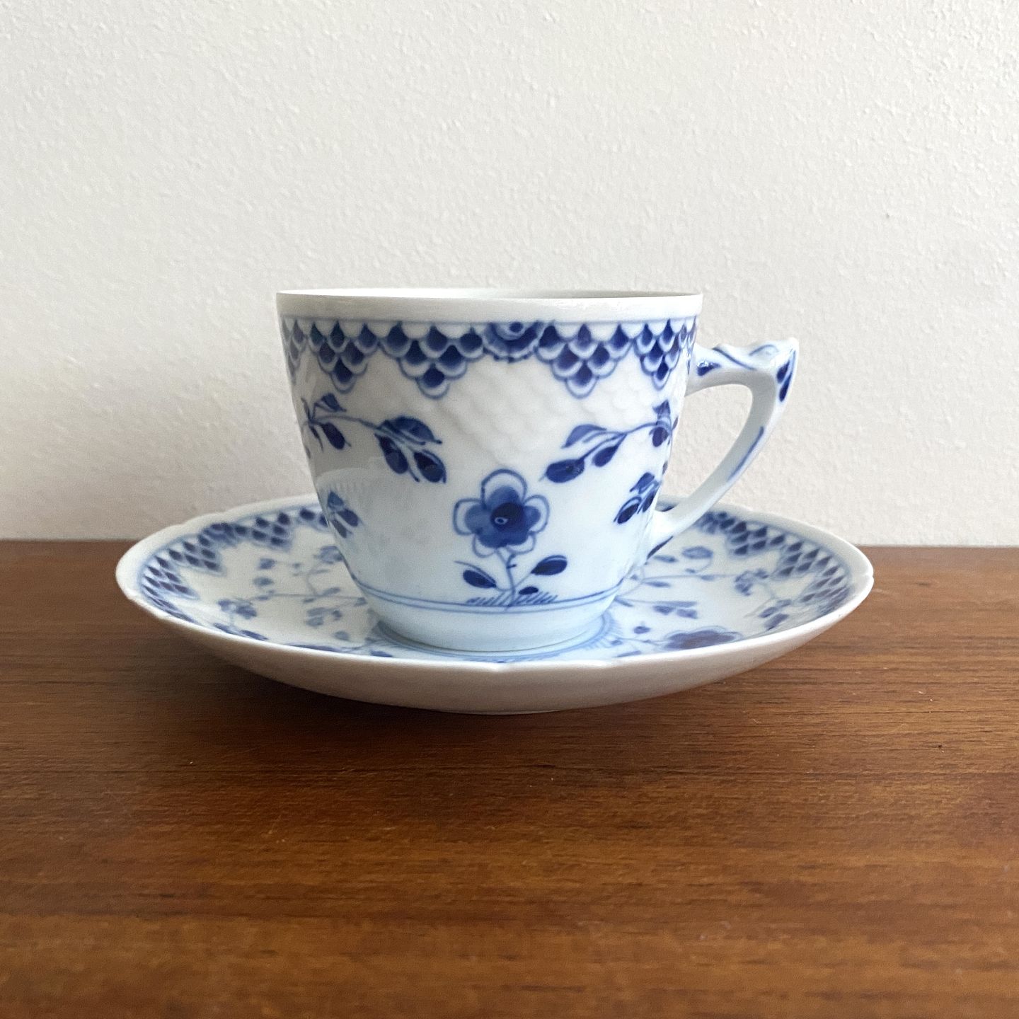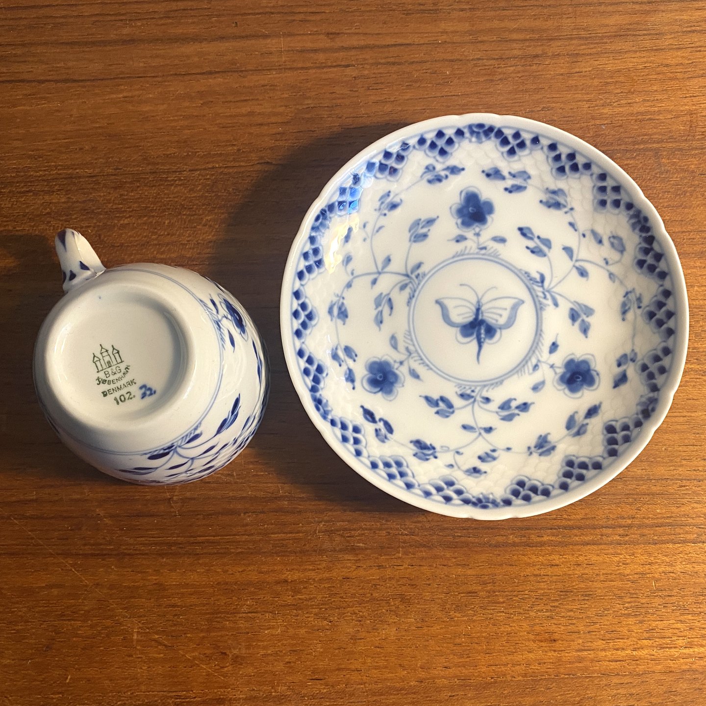 Blåmalet Dickens Sommerfugl halvblonde Musselmalet Kaffekop med underkop nr. 102.
