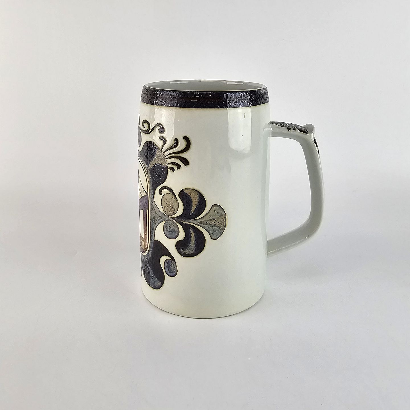 Krus af fajance med motiv af Den nye Lillebæltsbro i brune nuancer. År 1970.