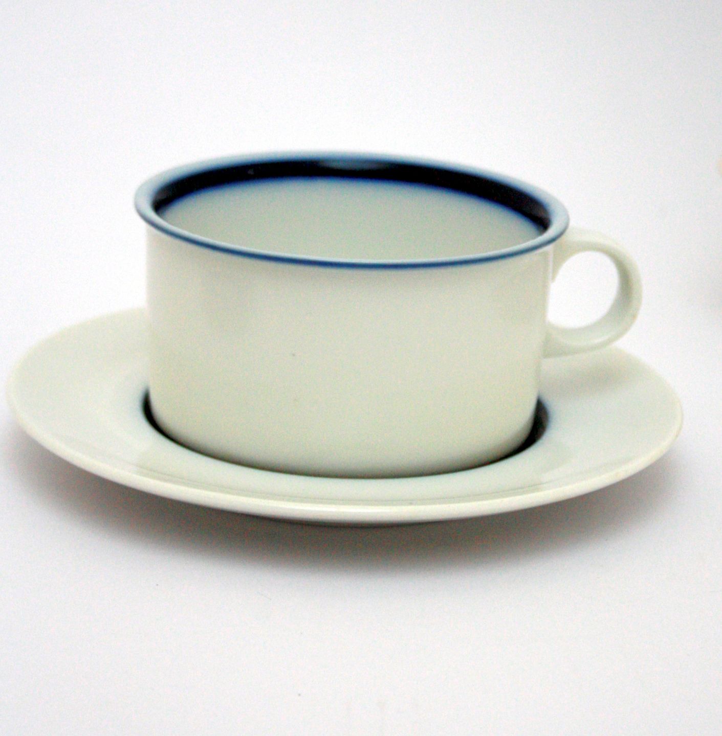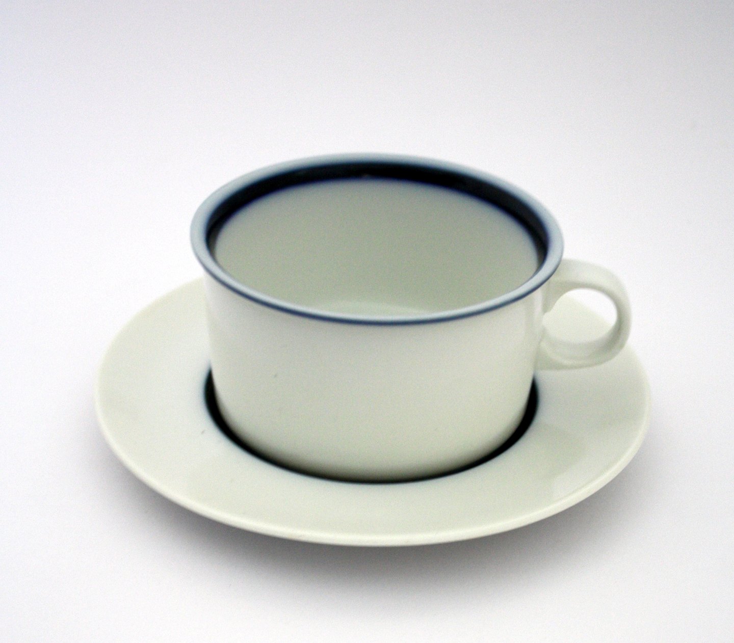 Text available in Danish: Royal Copenhagen, Indigo, Tekop med underkop, hvidt porcelæn med indigoblå kant. Designet af Anne Marie Trolle i midten af 1970'erne, udgår i midten af 1980'erne. Nr. 14911. Højde 5,5 cm. Diameter 10 cm. Underkop diameter 16 cm. II. sortering, hvilket betyder at der kan være små produktionsfejl. Pris: 200 kr. pr. par Lager: 7